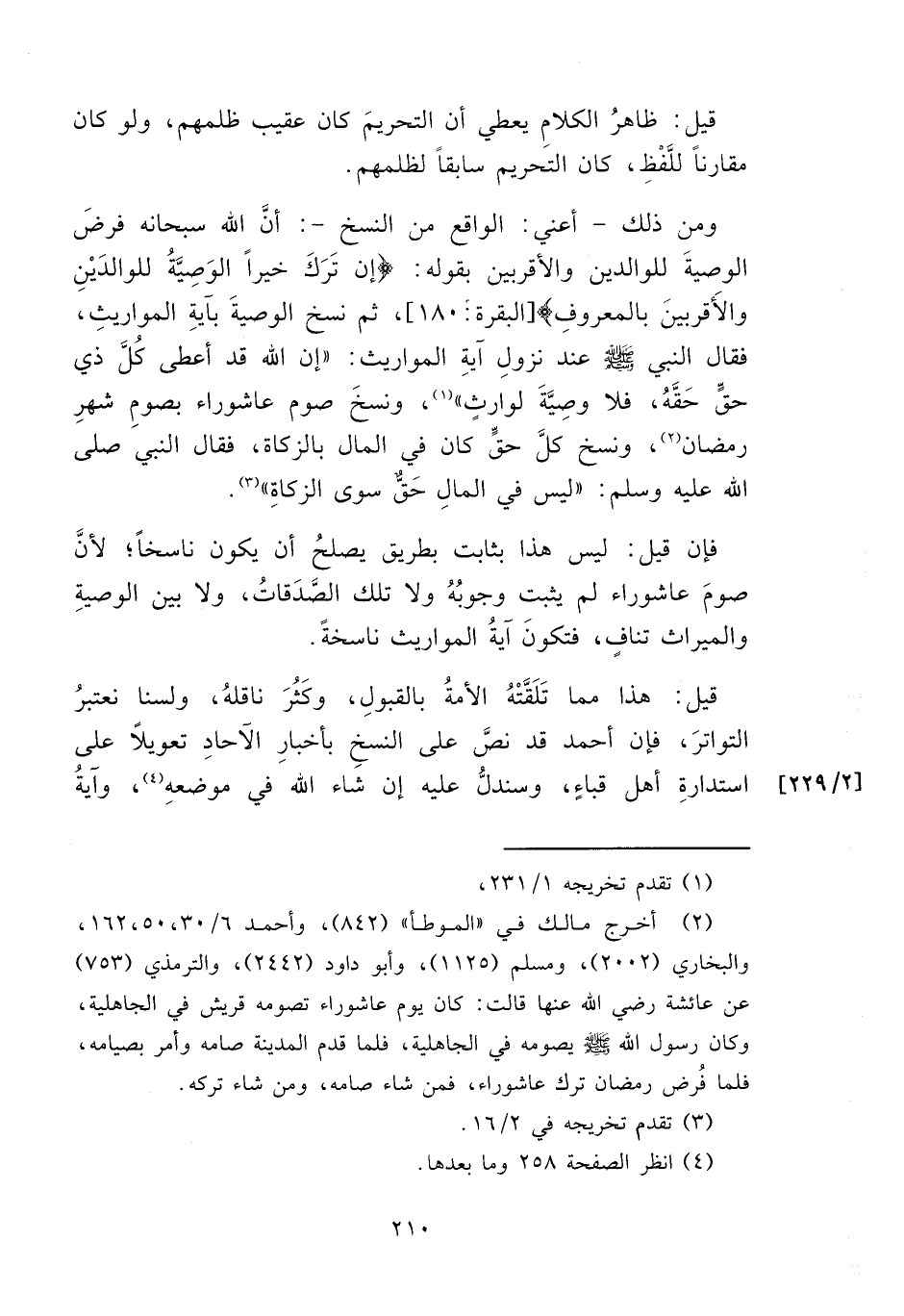 ومن ذلك -أعني: الواقع من النسخ-: أنَّ الله سبحانه فرضَ الوصيةَ للوالدين والأقربين بقوله: {إِنْ تَرَكَ خَيْرًا الْوَصِيَّةُ لِلْوَالِدَيْنِ وَالْأَقْرَبِينَ بِالْمَعْرُوفِ} [البقرة: ١٨٠]، ثم نسخ الوصيةَ بآيةِ المواريثِ، فقال النبي - صلى الله عليه وسلم - عند نزول آيةِ المواريث: "إن الله قد أعطى كُلَّ ذي حقٍّ حَقَّهُ، فلا وصِيَّةَ لوارثٍ" (١)، ونسخَ صوم عاشوراء بصومِ شهرِ رمضان (٢)، ونسخ كلَّ حقٍّ كان في المال بالزكاة، فقال النبي صلى الله عليه وسلم: "ليس في المال حَقٌّ سوى الزكاةِ" (٣).