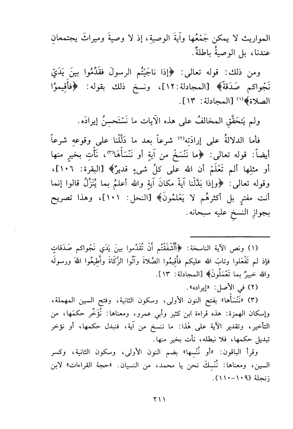 فأمَّا الدلالةُ على إرادَتِه (٢) شرعاً بعد ما دَلَّلْنا على وقوعهِ شرعاً أيضاً: قوله تعالى: {مَا نَنْسَخْ مِنْ آيَةٍ أَوْ ننْسأها (٣) نَأْتِ بِخَيْرٍ مِنْهَا أَوْ مِثْلِهَا أَلَمْ تَعْلَمْ أَنَّ اللَّهَ عَلَى كُلِّ شَيْءٍ قَدِيرٌ (١٠٦)} [البقرة: ١٠٦] وقوله تعالى: {وَإِذَا بَدَّلْنَا آيَةً مَكَانَ آيَةٍ وَاللَّهُ أَعْلَمُ بِمَا يُنَزِّلُ قَالُوا إِنَّمَا أَنْتَ مُفْتَرٍ بَلْ أَكْثَرُهُمْ لَا يَعْلَمُونَ} [النحل: ١٠١] وهذا تصريح بجوازِ النسخِ عليه سبحانه.