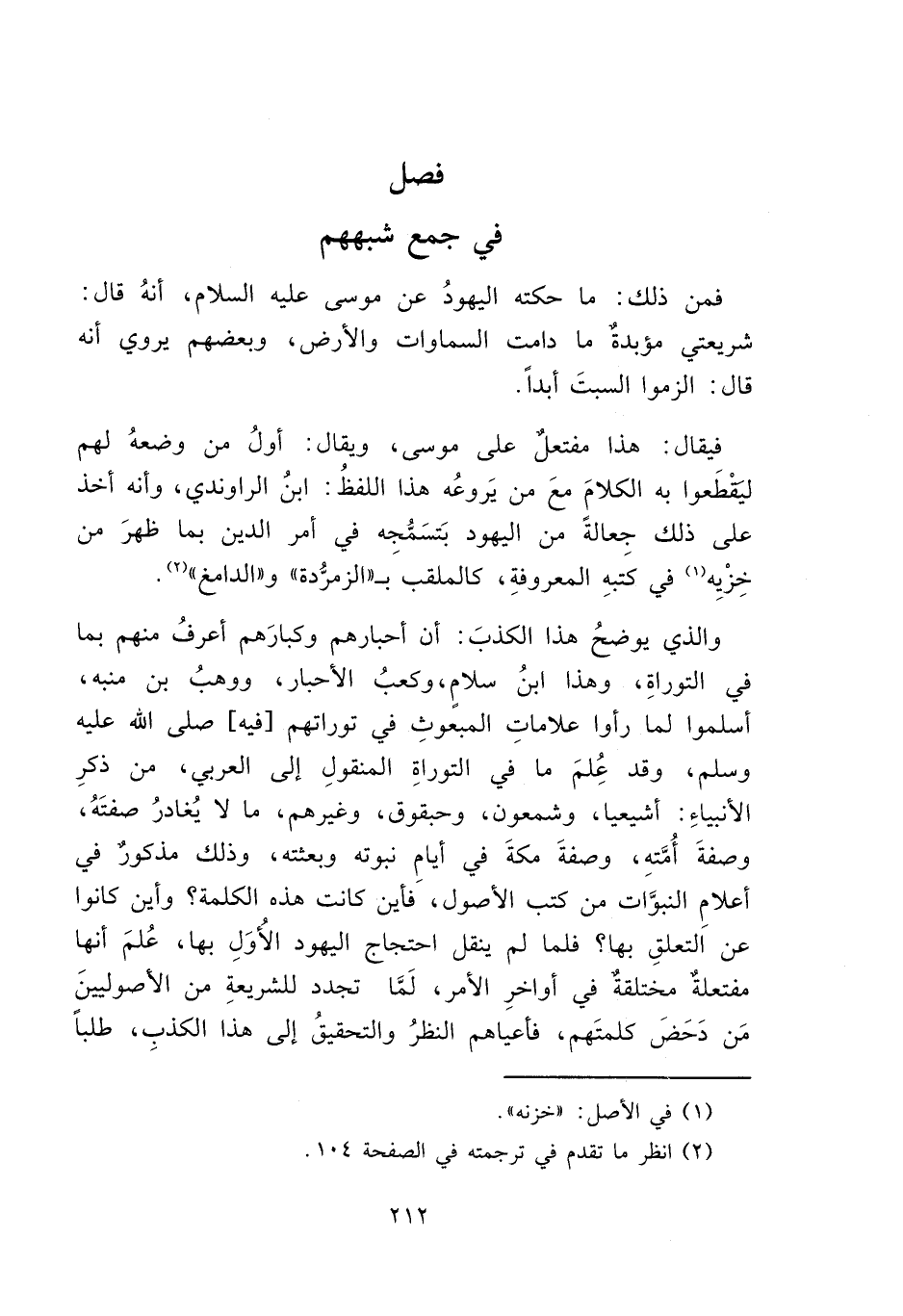 فيقال: هذا مفتعلٌ على موسى، ويقال: أول من وضعهُ لهم لتقْطَعوا به الكلامَ معَ من يَروعُه هذا اللفظُ ابنُ الراوندي، وأنه أخذ على ذلك جِعالةً من اليهود بَتسَمُّجه في أمر الدين بما ظهرَ من خِزْيِه (١) في كتبهِ المعروفةِ، كالملقبَ بـ "الزمرُّدة" و"الدامغ" (٢). والذي يوضحُ هذا الكذبَ: أن أحبارهم وكبارَهم أعرفُ منهم بما في التوراةِ، وهذا ابنُ سلامٍ، وكعبُ الأحبار، ووهبُ بن منبه، أسلموا لما رأوا علاماتِ المبعوثِ في توراتهم [فيه] صلى الله عليه وسلم، وقد عُلمَ ما في التوراةِ المنقول إلى العربي، من ذكرِ الأنبياءِ: أشيعيا، وشمعون، وحبقوق، وغيرهم، ما لا يُغادرُ صفتَهُ، وصفةَ أُمَّتهِ، وصفةَ مكةَ في أيامِ نبوته وبعثته، وذلك مذكورٌ في أعلامِ النبوَّات من كتب الأصول، فأين كانت هذه الكلمة؟ وأين كانوا عن التعلقِ بها؟ فلما لم ينقل احتجاج اليهود الأُوَل بها، عُلمَ أنها مفتعلةٌ مختلقةٌ في أواخرِ الأمر، لَمَّا تجدد للشريعةِ من الأصوليينَ مَن دَحَضَ كلمتَهم، فأعياهم النظرُ والتحقيقُ إلى هذا الكذبِ، طلباً