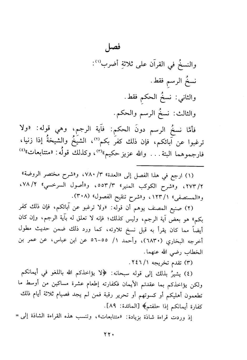 فأمَّا نسخُ الرسم دونَ الحكمِ: فاَية الرجمِ، وهي قوله: "ولا ترغبوا عن ابائكم، فإن ذلك كفر بكم (٢)، الشيخُ والشيخةُ إذا زنيا، فارجموهما البتة ... والله عزيز حكم " (٣)، وكذلك قولُه: "متتابعات" (٤)
