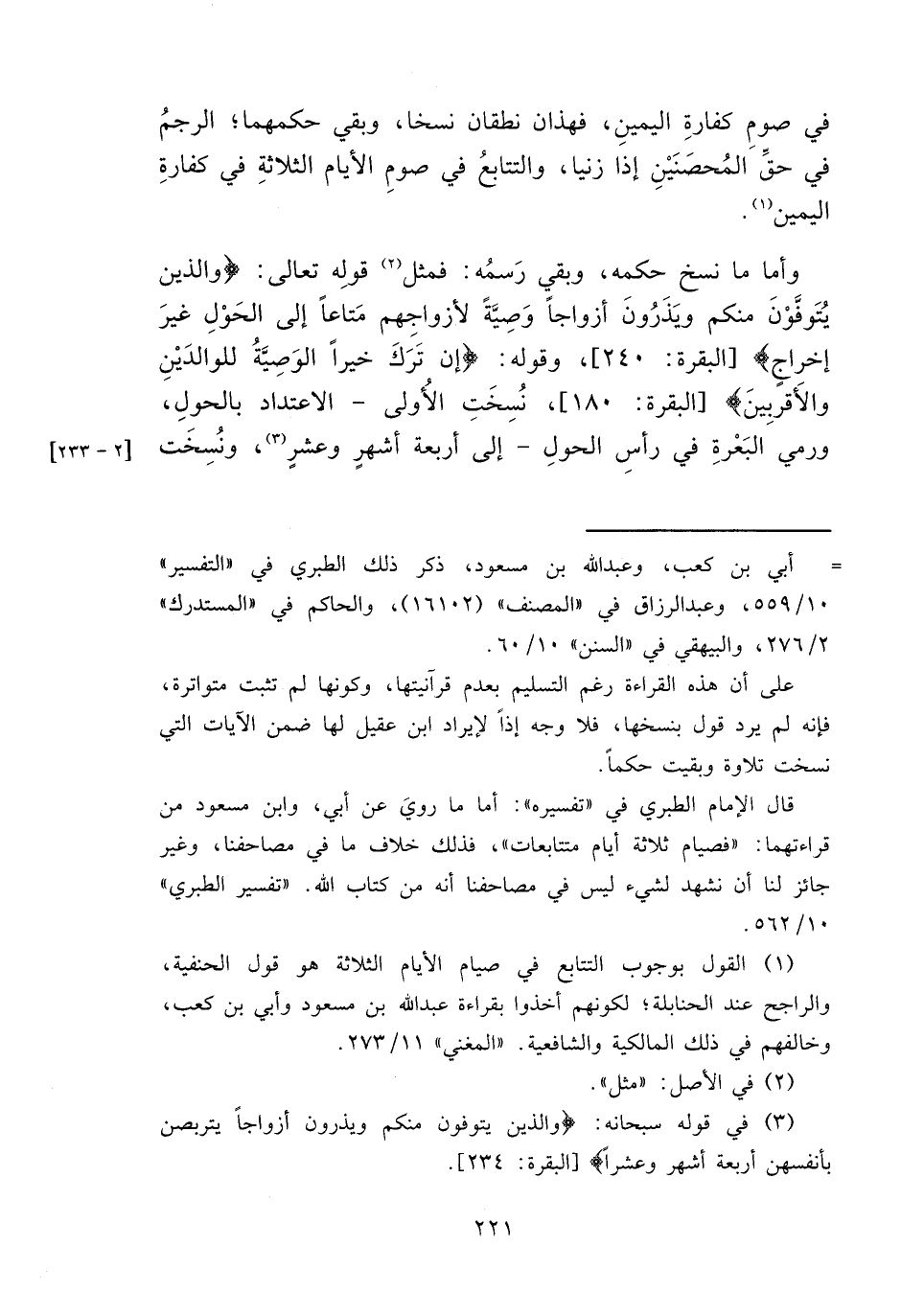 في صومِ كفارةِ اليمينِ، فهذان نطقان نسخا، وبقي حكمهما؛ الرجمُ في حقِّ المُحصَنَيْنِ إذا زنيا، والتتابعُ في صومِ الأيام الثلاثةِ في كفارةِ اليمين (١).