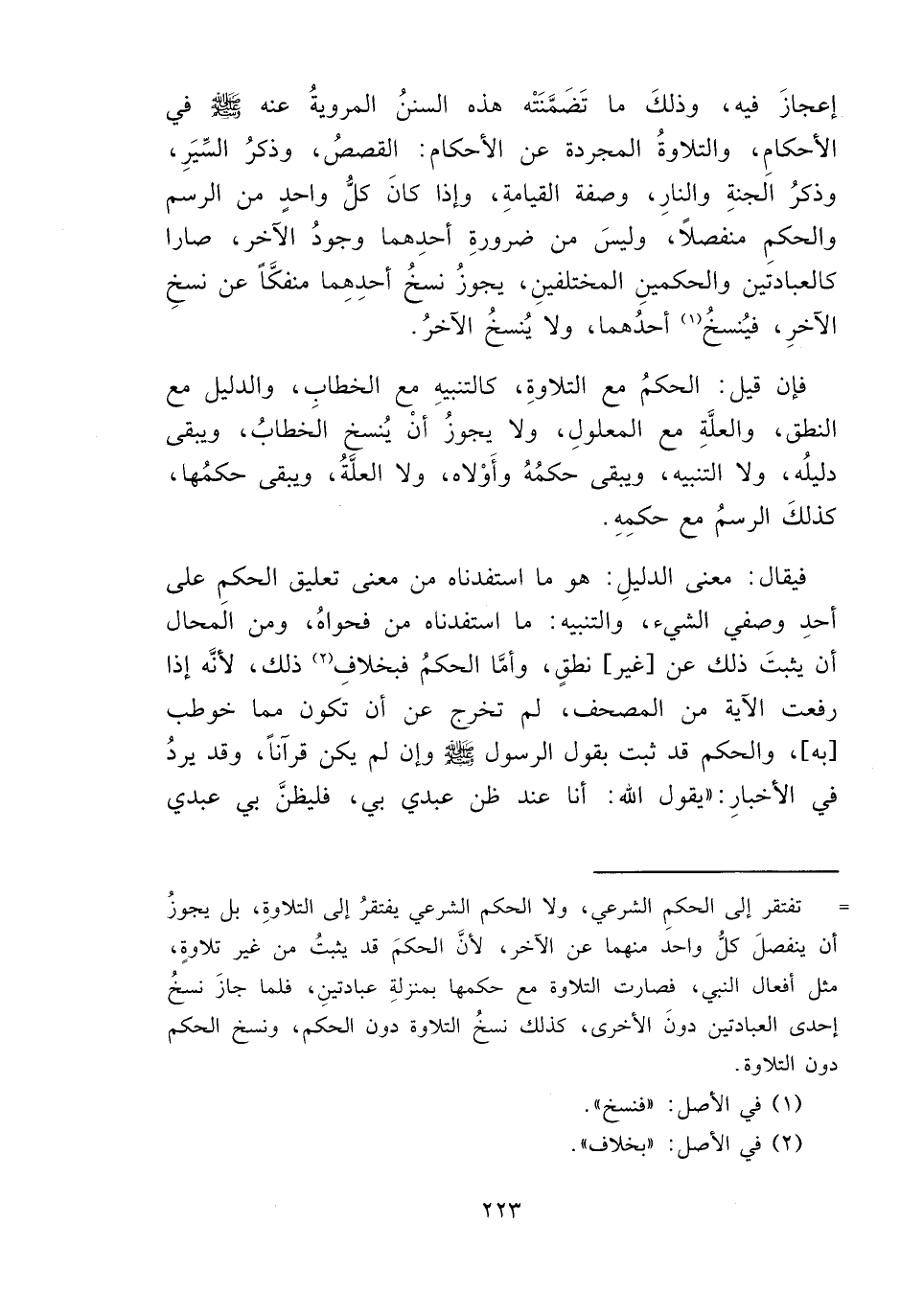 = تفتقر إلى الحكمِ الشرعي، ولا الحكم الشرعي يفتقرُ إلى التلاوةِ، بل يجوزُ أن ينفصلَ كلُّ واحد منهما عن الآخر، لأنَّ الحكمَ قد يثبتُ من غير تلاوةٍ، مثل أفعال النبي، فصارت التلاوة مع حكمها بمنزلةِ عبادتينِ، فلما جازَ نسخُ إحدى العبادتين دونَ الأخرى، كذلك نسخُ التلاوة دون الحكم، ونسخ الحكم دون التلاوة.