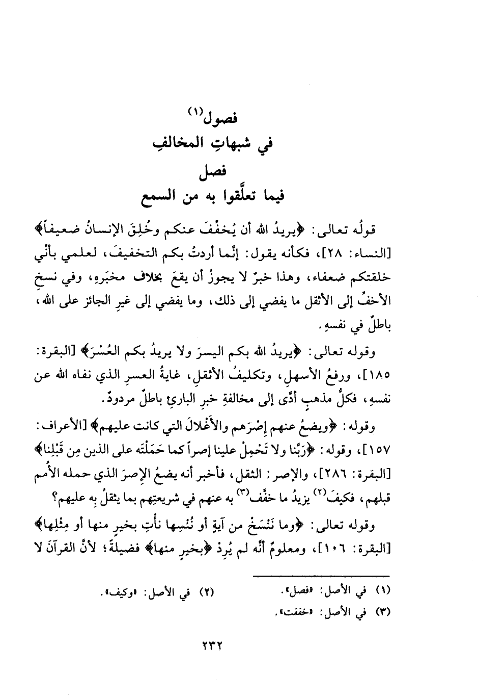 قولُه تعالى: {يُرِيدُ اللَّهُ أَنْ يُخَفِّفَ عَنْكُمْ وَخُلِقَ الْإِنْسَانُ ضَعِيفًا} [النساء: ٢٨]، فكأنه يقول: إنَّما أردتُ بكم التخفيفَ، لعلمي بأنَّي خلقتكم ضعفاء، وهذا خبر لا يجوزُ أن يقعَ بخلاف مخبَرهِ، وفي نسخِ الأخفِّ إلى الأثقل ما يفضي إلى ذلك، وما يفضي إلى غيرِ الجائز على الله، باطلٌ في نفسهِ.