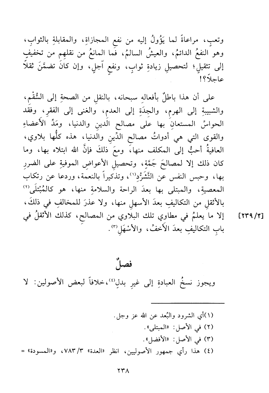 على أن هذا باطلٌ بأفعالهِ سبحانه، بالنقلِ من الصحةِ إلى السُّقْمِ، والشبيبةِ إلى الهرمِ، والجدَةِ إلى العدمِ، والغنى إلى الفقرِ، وفقد الحواسِّ المستعانِ بها عَلى مصالح الدينِ والدنيا، ومَدِّ الأَعضاءِ والقوى التي هي أدواتُ مصالح الدِّينِ والدنيا، هذه كلُّها بلاوي، العافيةُ أحبُّ إلى المكلف منها، ومعَ ذلكَ فإنَّ الله ابتلاه بها، وما كان ذلك إلا لمصالحَ جَمَّةٍ، وتحصيلِ الأعواضِ الموفيةِ على الضررِ بها، وحبس النفس عن التَّشَرُدِ (١)، وتذكيراً بالنعمة، وردعا عن ارتكاب المعصيةِ، والمبتلى بها بعدَ الراحة والسلامةِ منها، هو كالمُبْتلَى (٢) بالأثقلِ من التكاليفِ بعدَ الأسهلِ منها، ولا عذرَ للمخالفِ في ذلكَ، إلا ما يعلمُ في مطاوي تلك البلاوي من المصالح، كذلك الأثقلُ في بابِ التكاليفِ بعدَ الأَخفِّ، والأسْهَلِ (٣).