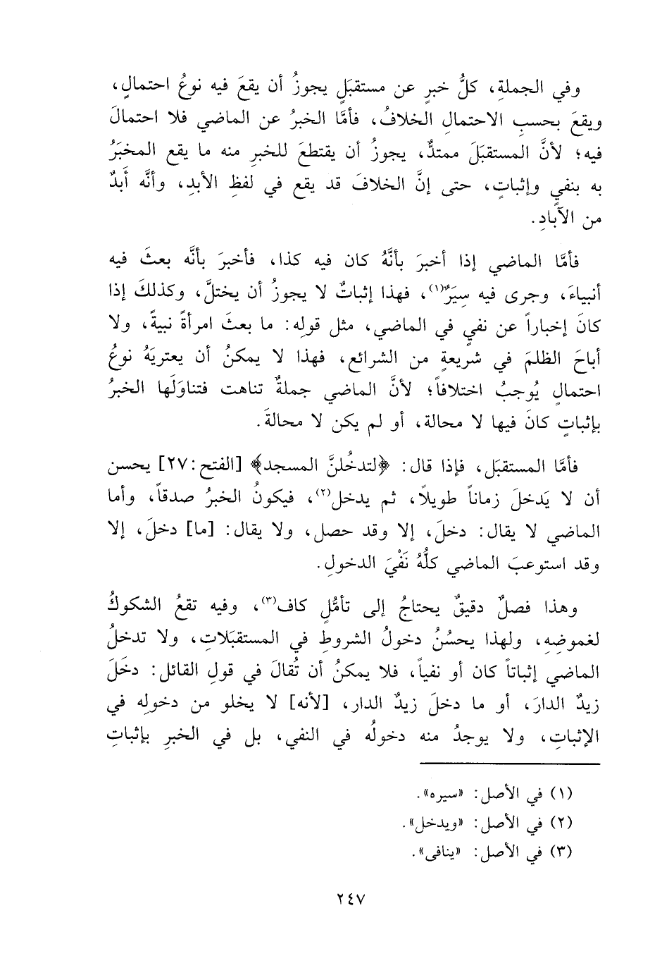وفي الجملةِ، كلُّ خبرٍ عن مستقبَلٍ يجوزُ أن يقعَ فيه نوعُ احتمالٍ، ويقعَ بحسب الاحتمالِ الخلافُ، فأمَّا الخبرُ عن الماضي فلا احتمالَ فيه، لأنَّ المستقبَلَ ممتدٌّ، يجوزُ أن يقتطعَ للخبرِ منه ما يقع المخبَرُ به بنفيٍ وإثباتٍ، حتي إنَّ الخلافَ قد يقع في لفظِ الأبدِ، وأنَّه أبدٌ من الآبادِ.