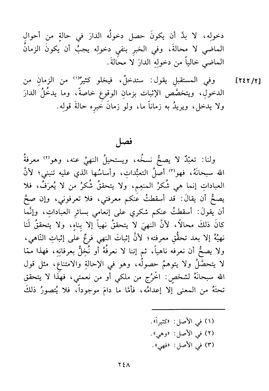 ولنا: تعبّدٌ لا يصحُّ نسخُه، ويستحيلُ النهيُ عنه، وهو (٢) معرفةُ الله سبحانَهُ، فهو (٣) أصلُ التعبُّداتِ، وأساسُها الذي عليه تنبني؛ لأنَّ العباداتِ إنما هي شُكرُ المنعِمِ، ولا يتحققُ شُكرُ من لا يُعرَفُ، فلا يصحُّ أن يقالَ: قد أسقطتُ عنكم معرفتي، فلا تعرفوني، وإن صحَّ أن يقولَ: أسقطتُ عنكم شكري على إنعامي بسائرِ العباداتِ، وإنَّما كانَ ذلكَ محالاً، لأنَّ النهيَ لا يتحققُ نهياً إلا بِناهٍ، ولا يتحققُ لَنا نهيُهُ إلا بعد تحقُّقِ معرفته؛ لأن إثباتَ النهي فرعٌ على إثباتِ النّاهي، ولا يصحُّ أن نعرفه ناهياً، ثم إننا لا نعرفُهُ أو نُخِلُّ بعرفانِهِ، فهذا مما لا يتحصَّلُ ولا يتوهمُ حصوله، وهو في الإحالةِ والامتناعِ، مثل قول الله سبحانَهُ لشخص: اخْرُج من ملكي أو من نعمتي، فهذا لا يتحقق تحتَهُ من المعنى إلا إعدامُه، فأمَّا ما دامَ موجوداً، فلا يُتصورُ ذلكَ