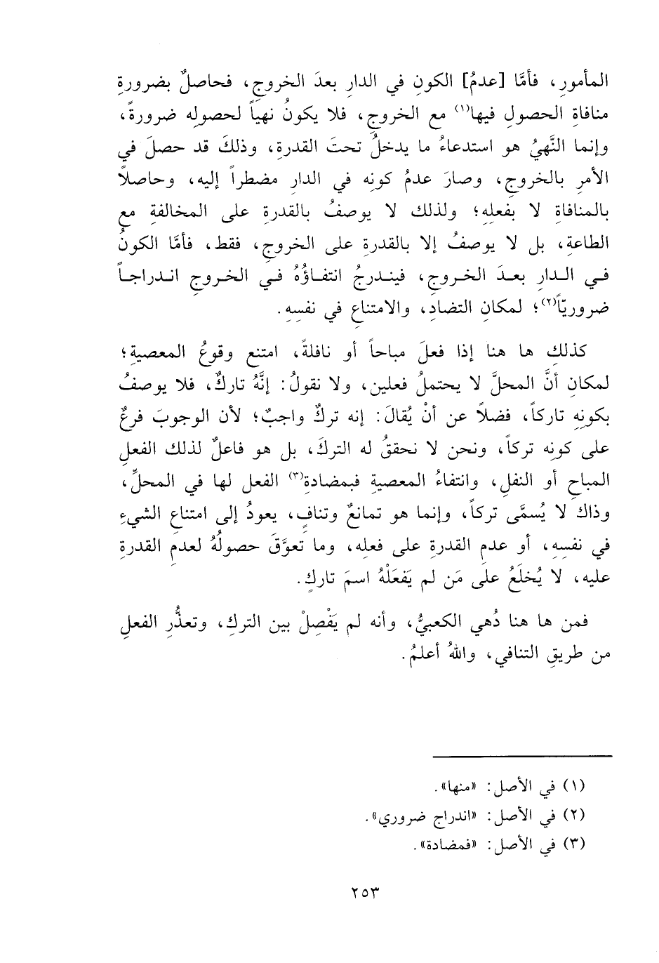 المأمورِ، فأمَّا [عدمُ] الكونِ في الدارِ بعدَ الخروجِ، فحاصلٌ بضرورةِ منافاةِ الحصولِ فيها (١) مع الخروجِ، فلا يكونُ نهياً لحصوله ضرورةً، وإنما النَّهي هو استدعاءُ ما يدخلُ تحتَ القدرةِ، وذلكَ قد حصلَ في الأمرِ بالخروجِ، وصارَ عدمُ كونِه في الدارِ مضطراً إليه، وحاصلاً بالمنافاةِ لا بفعلِهِ؛ ولذلك لا يوصف بالقدرةِ على المخالفةِ مع الطاعةِ، بل لا يوصفُ إلا بالقدرةِ على الخروجِ، فقط، فأمَّا الكون في الدارِ بعدَ الخروجِ، فيندرجُ انتفاؤُهُ في الخروجِ اندراجاً ضروريّاً (٢)؛ لمكانِ التضادِ، والامتناعِ في نفسِهِ.