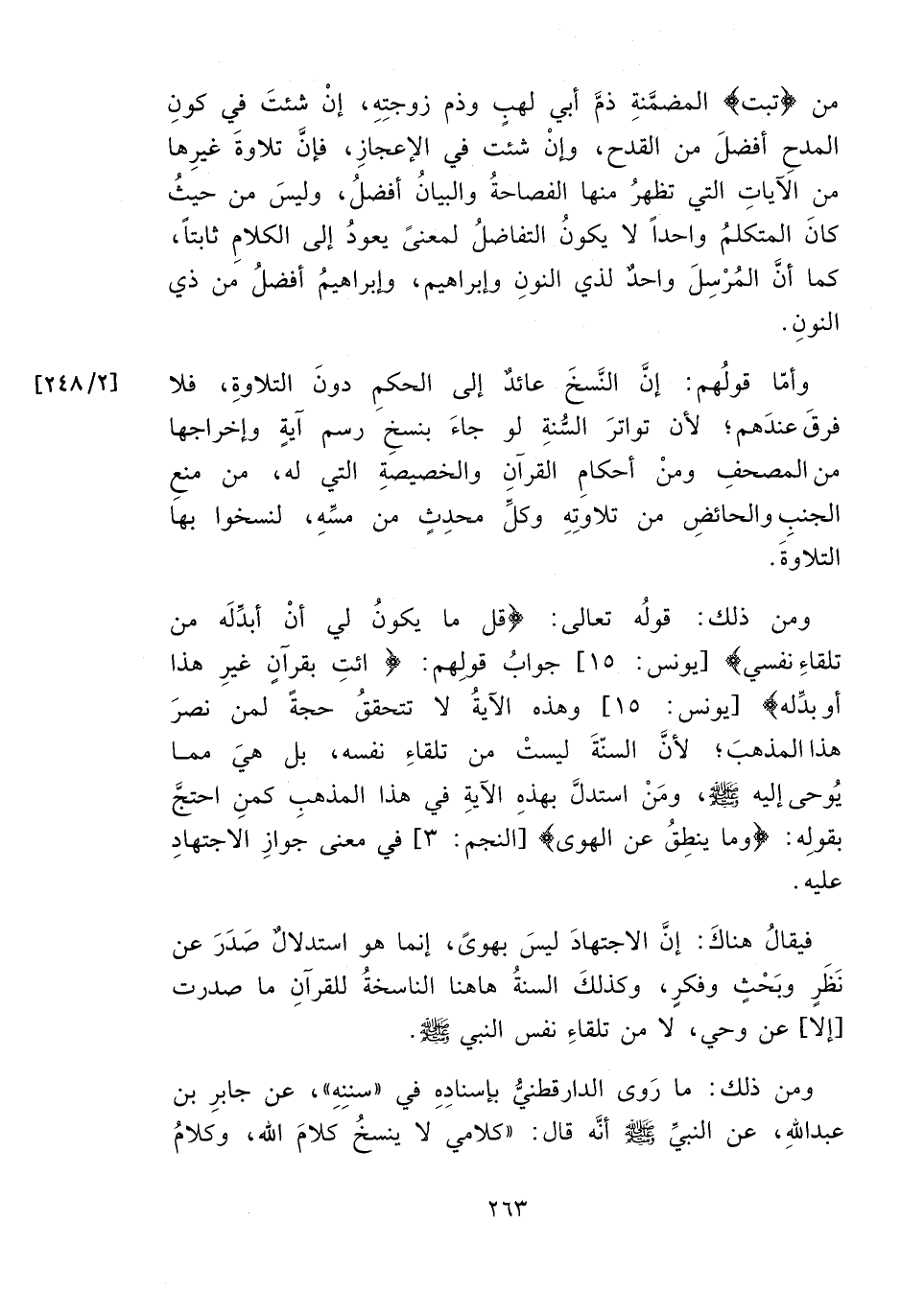 ومن ذلك: قولُه تعالى: {قُلْ مَا يَكُونُ لِي أَنْ أُبَدِّلَهُ مِنْ تِلْقَاءِ نَفْسِي} [يونس: ١٥] جوابُ قولِهم: {ائْتِ بِقُرْآنٍ غَيْرِ هَذَا أَوْ بَدِّلْهُ} [يونس: ١٥] وهذه الآيةُ لا تتحققُ حجةً لمن نصرَ هذا المذهبَ؛ لأنَّ السنّةَ ليستْ من تلقاءِ نفسه، بل هيَ مما يُوحى إليه - صلى الله عليه وسلم -، ومَنْ استدلَّ بهذهِ الآيةِ في هذا المذهبِ كمنِ احتجَّ بقولِه: {وَمَا يَنْطِقُ عَنِ الْهَوَى} [النجم: ٣]، في معنى جوازِ الاجتهادِ عليه.