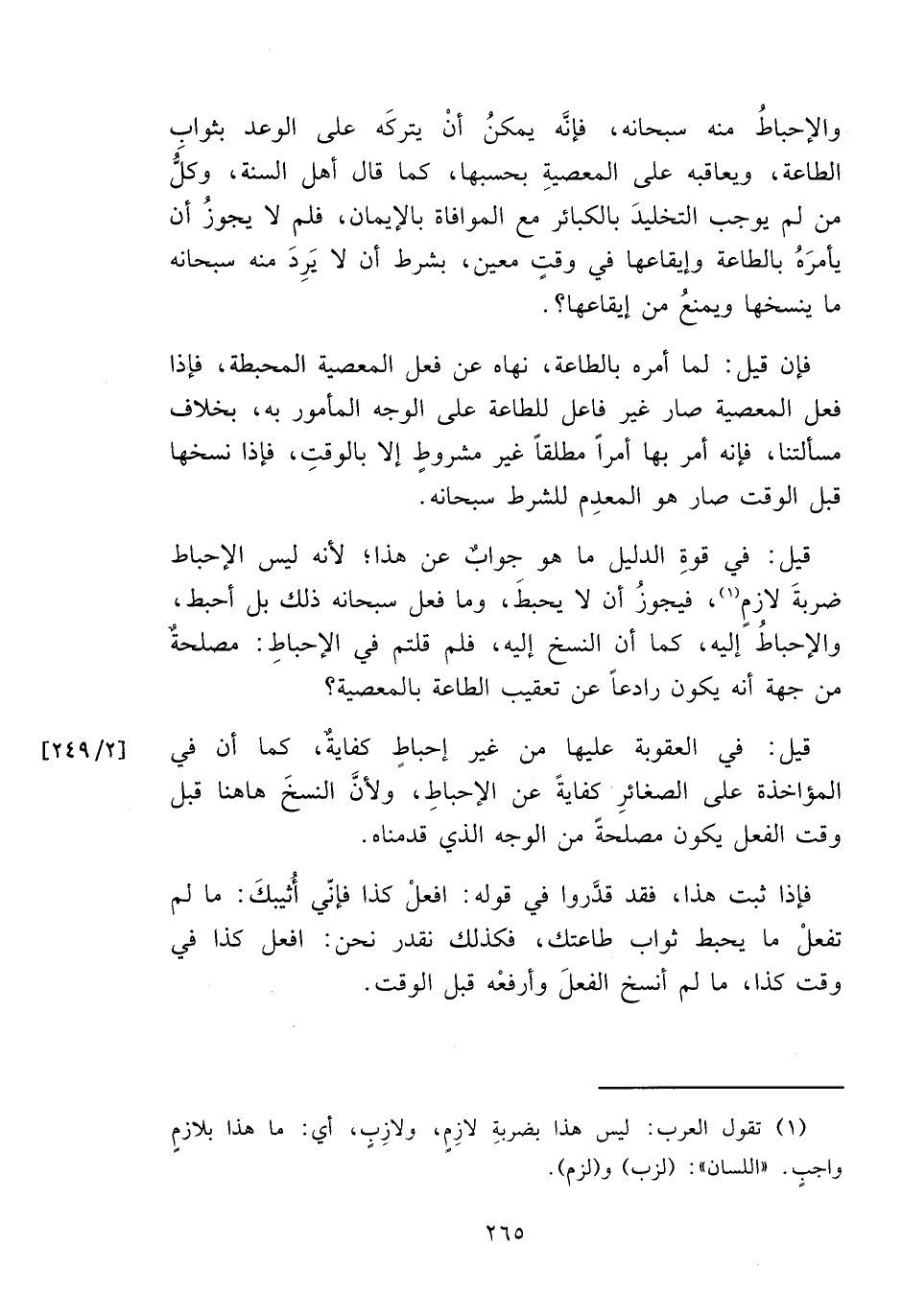 والإحباط منه سبحانه، فإنه يمكن أنْ يتركَه على الوعد بثواب الطاعة، ويعاقبه على المعصيةِ بحسبها، كما قال أهل السنة، وكلُّ من لم يوجب التخليدَ بالكبائر مع الموافاة بالإيمان، فلم لا يجوزُ أن يأمرَهُ بالطاعة وإيقاعها في وقتٍ معين، بشرط أن لا يَرِدَ منه سبحانه ما ينسخها ويمنعُ من إيقاعها؟.