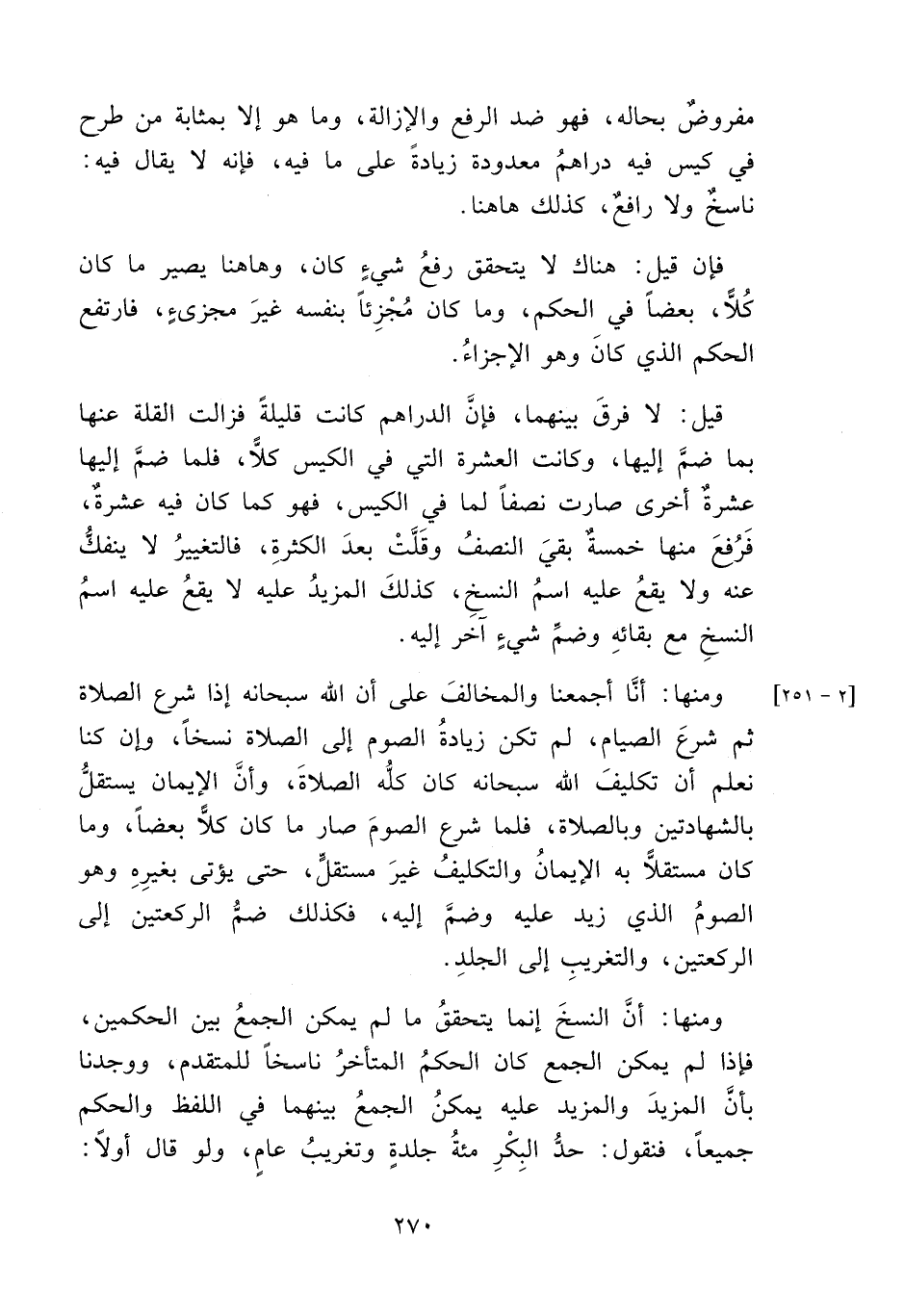 ومنها: أنَّ النسخَ إنما يتحققُ ما لم يمكن الجمعُ بين الحكمين، فاذا لم يمكن الجمع كان الحكمُ المتأخرُ ناسخاً للمتقدم، ووجدنا بأنَّ المزيدَ والمزيد عليه يمكنُ الجمعُ بينهما في اللفظ والحكم جميعاً، فنقول: حدُ البِكْرِ مئةُ جلدةٍ وتغريبُ عامٍ، ولو قال أولاً: