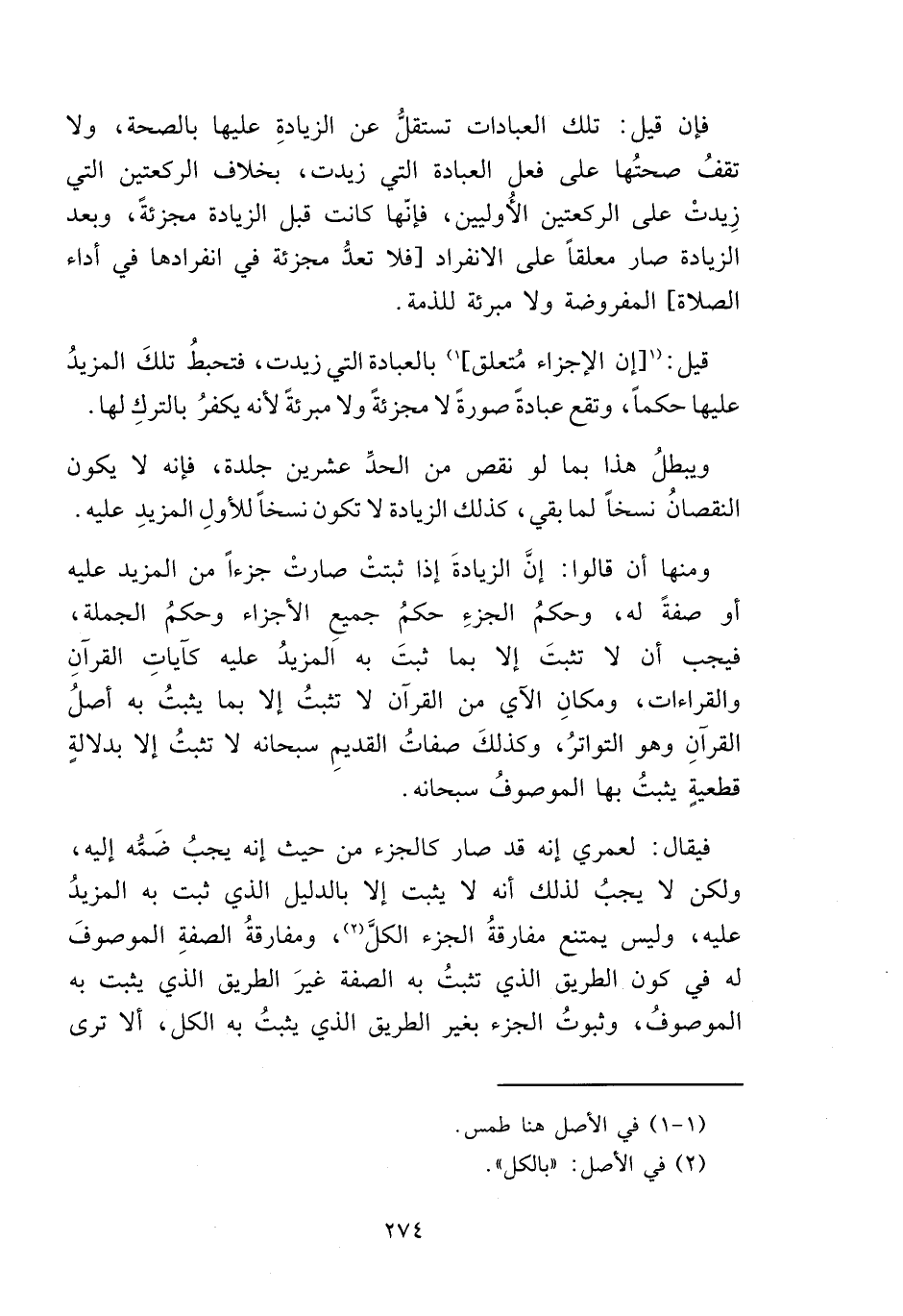 ومنها أن قالوا: إنَّ الزيادةَ إذا ثبتتْ صارتْ جزءاً من المزيد عليه أو صفةً له، وحكمُ الجزءِ حكمُ جميعِ الأجزاء وحكمُ الجملة، فيجب أن لا تثبتَ إلا بما ثبتَ به المزيدُ عليه كآياتِ القرآنِ والقراءات، ومكانِ الآي من القرآن لا تثبتُ إلا بما يثبتُ به أصلُ القرآنِ وهو التواترُ، وكذلكَ صفاتُ القديمِ سبحانه لا تثبتُ إلا بدلالةٍ قطعيةٍ يثبتُ بها الموصوفُ سبحانه.