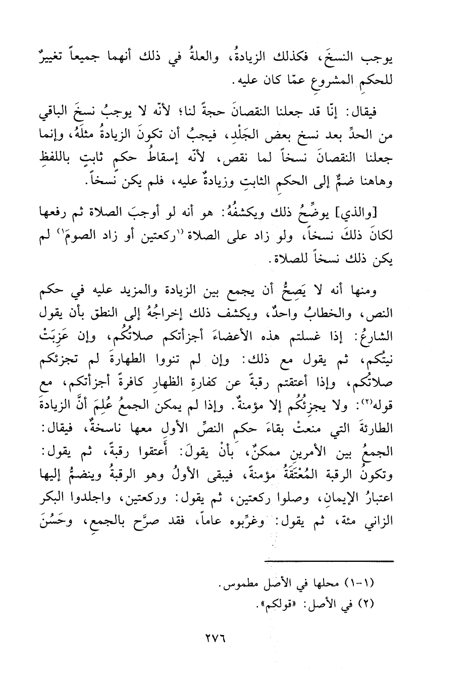 [والذي] يوضِّحُ ذلك ويكشفُهُ: هو أنه لو أوجبَ الصلاة ثم رفعها لكانَ ذلكَ نسخاً، ولو زاد على الصلاة (١ ركعتين أو زاد الصومَ ١) لم يكن ذلك نسخاً للصلاة.