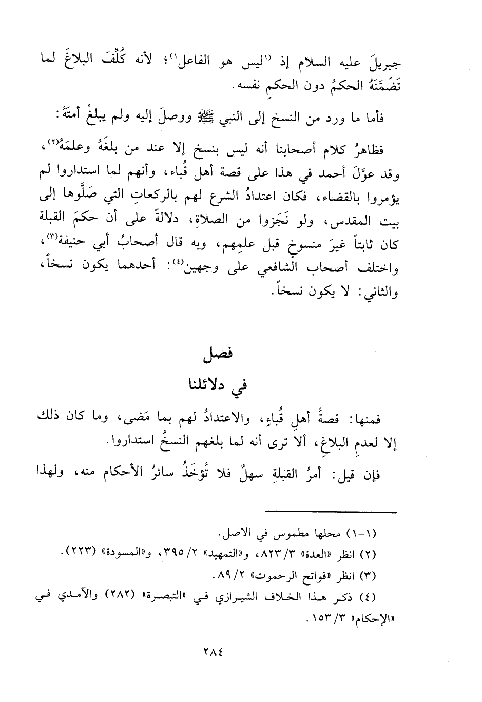 فأمَّا ما ورد من النسخ إلى النبي - صلى الله عليه وسلم - ووصلَ إليه ولم يبلغْ أمتَهُ: فظاهرُ كلام أصحابنا أنه ليس بنسخ إلا عند من بلغَهُ وعلمَه (٢)، وقد عوَّلَ أحمد في هذا على قصة أهل قُباء، وأنهم لما استداروا لم يؤمروا بالقضاء، فكان اعتدادُ الشرع لهم بالركعاتِ التي صَلَّوها إلى بيت المقدس، ولو نَجَزوا من الصلاةِ، دلالةً على أن حكمَ القبلة كان ثابتاً غيرَ منسوخٍ قبل علمِهم، وبه قال أصحابُ أبي حنيفة (٣)، واختلف أصحاب الشافعي على وجهين (٤): أحدهما يكون سخاً، والثاني: لا يكون نسخاً.