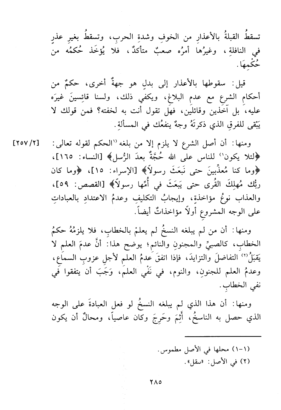 ومنها: أن أصل الشرع لا يلزم إلا من بلغه (١ الحكم لقوله تعالى: {لِئَلَّا يَكُونَ ١) لِلنَّاسِ عَلَى اللَّهِ حُجَّةٌ بَعْدَ الرُّسُلِ [النساء: ١٦٥] {وَمَا كُنَّا مُعَذِّبِينَ حَتَّى نَبْعَثَ رَسُولًا} [الإسراء: ١٥] {وَمَا كَانَ رَبُّكَ مُهْلِكَ الْقُرَى حَتَّى يَبْعَثَ فِي أُمِّهَا رَسُولًا} [القصص: ٥٩] والعذاب نوعُ مؤاخذةٍ، وإيجابُ التكليفِ وعدمُ الاعتدادِ بالعباداتِ على الوجه المشروعِ أولاً مؤاخذاتٌ أيضاً.