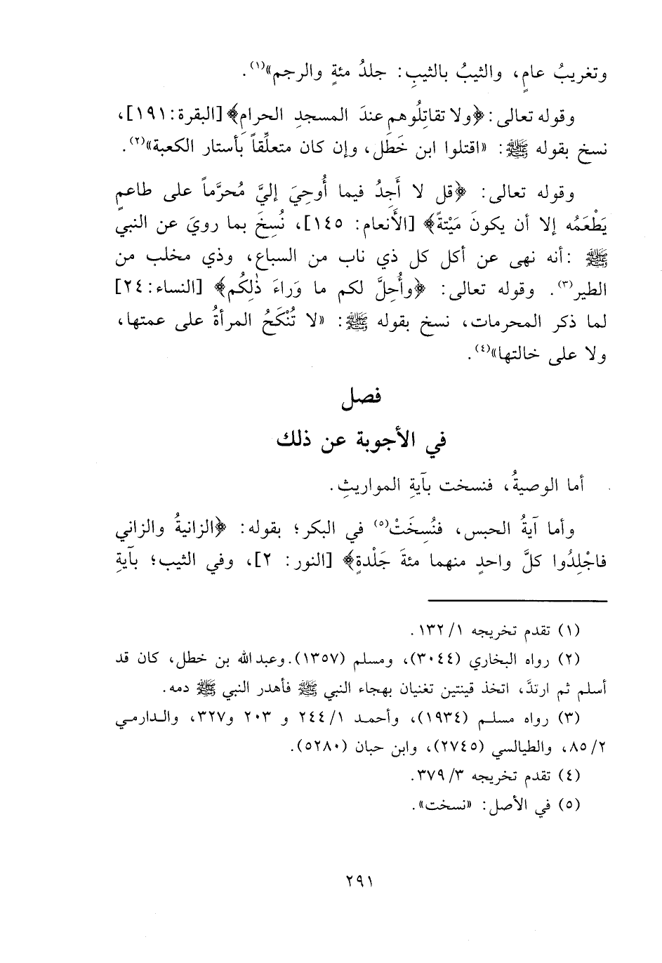 وأما آيةُ الحبس، فنُسِخَتْ (٥) في البكر؛ بقوله {الزَّانِيَةُ وَالزَّانِي فَاجْلِدُوا كُلَّ وَاحِدٍ مِنْهُمَا مِائَةَ جَلْدَةٍ} [النور: ٢] وفي الثيب، باَيةِ