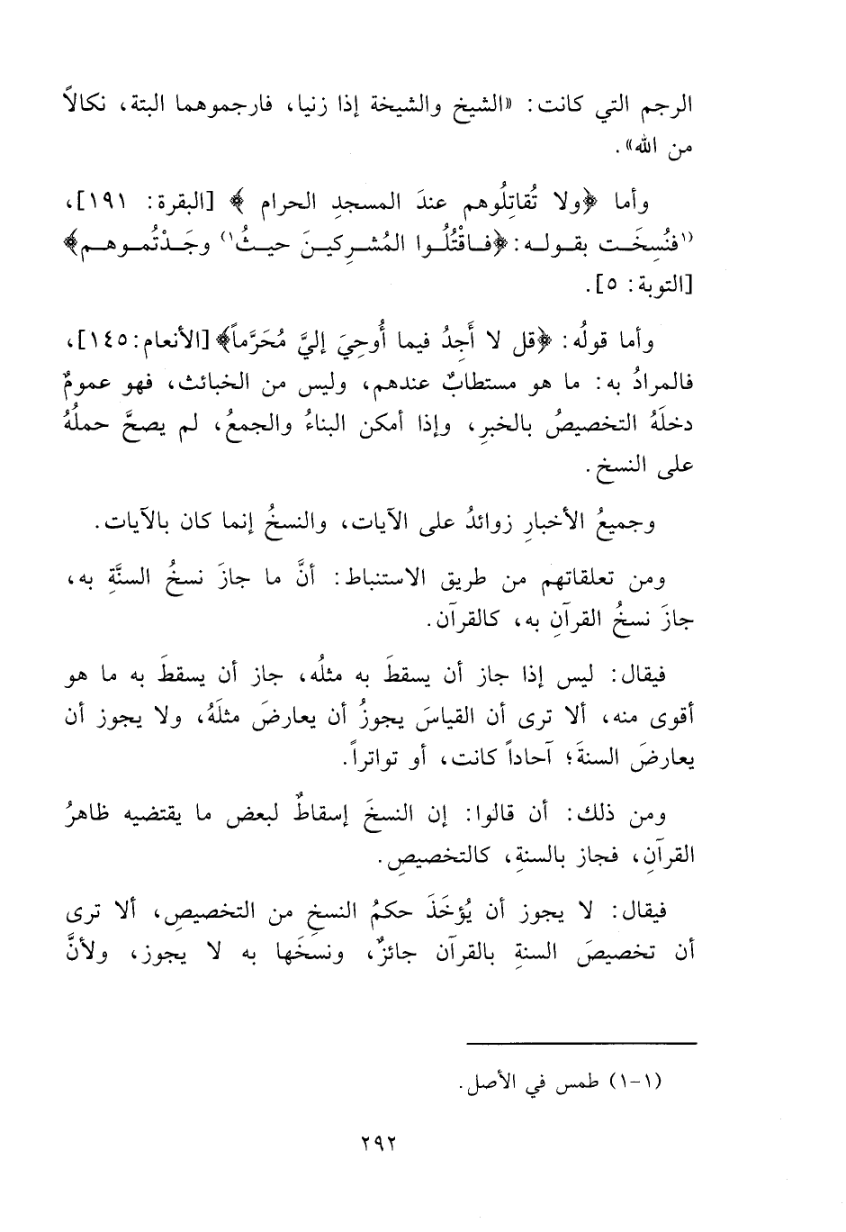 ومن ذلك: أن قالوا: إن النسخَ إسقاط لبعض ما يقتضيه ظاهرُ القرآنِ، فجارْ بالسنةِ، كالتخصيصِ.