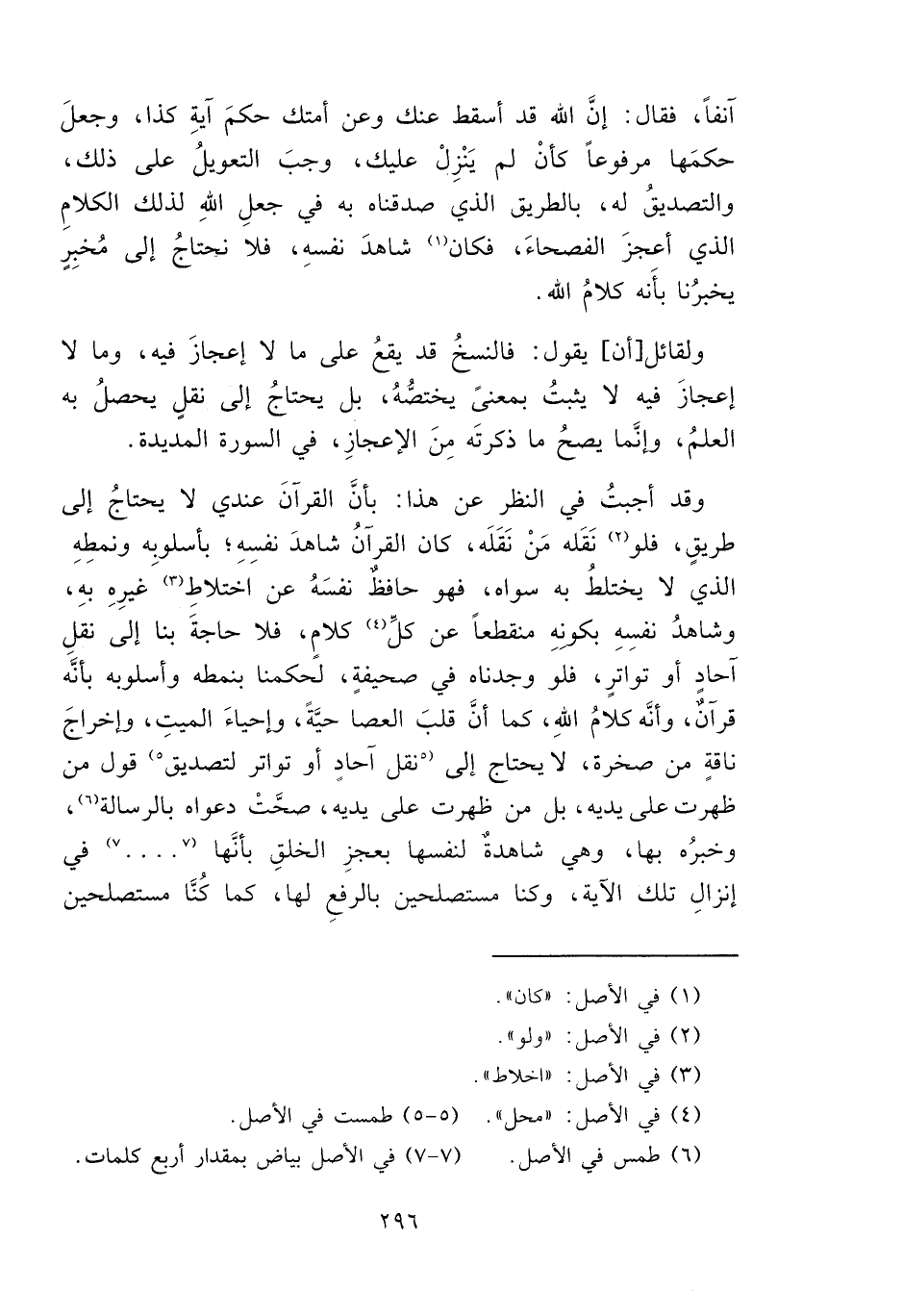 وقد أجبتُ في النظر عن هذا: بأنَّ القرآنَ عندي لا يحتاجُ إلى طريقٍ، فلو (٢) نَقَله مَنْ نَقَلَه، كان القرآنُ شاهدَ نفسِهِ؛ بأسلوبِه ونمطِهِ الذي لا يختلطُ به سواه، فهو حافظٌ نفسَهُ عن اختلاطِ (٣) غيرِهِ بهِ، وشاهدُ نفسِهِ بكونِهِ منقطعاً عن كلِّ (٤) كلامٍ، فلا حاجةَ بنا إلى نقلِ آحادٍ أو تواترٍ، فلو وجدناه في صحيفةٍ، لحكمنا بنمطه وأسلوبه بأنَّه قرآنٌ، وأنَّه كلامُ اللهِ، كما أنَّ قلبَ العصا حيَّةً، وإحياءَ الميتِ، وإخراجَ ناقةٍ من صخرة، لايحتاج إلى (٥ نقل آحادٍ أو تواتر لتصديق ٥) قول من ظهرت على يديه، بل من ظهرت على يديه، صحَّتْ دعواه بالرسالة (٦)، وخبرُه بها، وهي شاهدةٌ لنفسها بعجزِ الخلقِ بأنَّها (٧ ....... ٧) في إنزالِ تلك الآية، وكنا مستصلحين بالرفعِ لها، كما كُنَّا مستصلحين