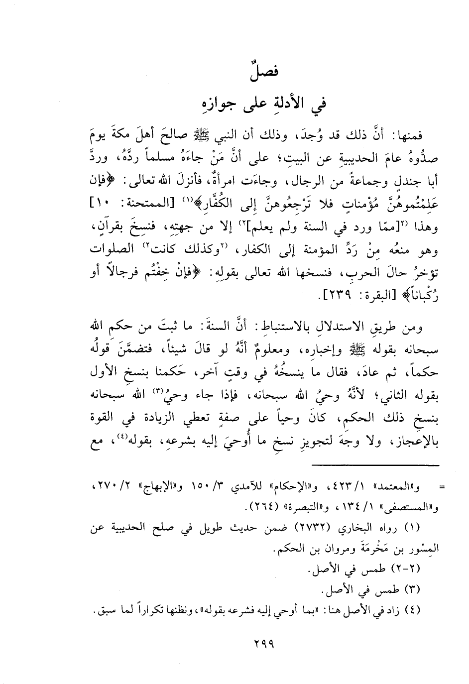 فمنها: أنَّ ذلك قد وُجدَ، وذلك أن النبي - صلى الله عليه وسلم - صالحَ أهلَ مكةَ يومَ صدُّوهُ عامَ الحديبيةِ عن البيتِ؛ على أنَّ مَنْ جاءَهُ مسلماً ردَّهُ، وردَّ أبا جندلٍ وجماعةً من الرجال، وجاءَت امرأةٌ، فأنزلَ الله تعالى: {فَإِنْ عَلِمْتُمُوهُنَّ مُؤْمِنَاتٍ فَلَا تَرْجِعُوهُنَّ إِلَى الْكُفَّارِ} (١) [الممتحنة: ١٠] وهذا (٢ [ممّا ورد في السنة ولم يعلم] ٢) إلا من جهتِهِ، فنسِخَ بقرآنٍ، وهو منعُه مِنْ رَدِّ المؤمنة إلى الكفار، (٢ وكذلك كانت ٢) الصلوات تؤخرُ حالَ الحربِ، فنسخها الله تعالى بقولِهِ: {فَإِنْ خِفْتُمْ فَرِجَالًا أَوْ رُكْبَانًا} [البقرة: ٢٣٩].