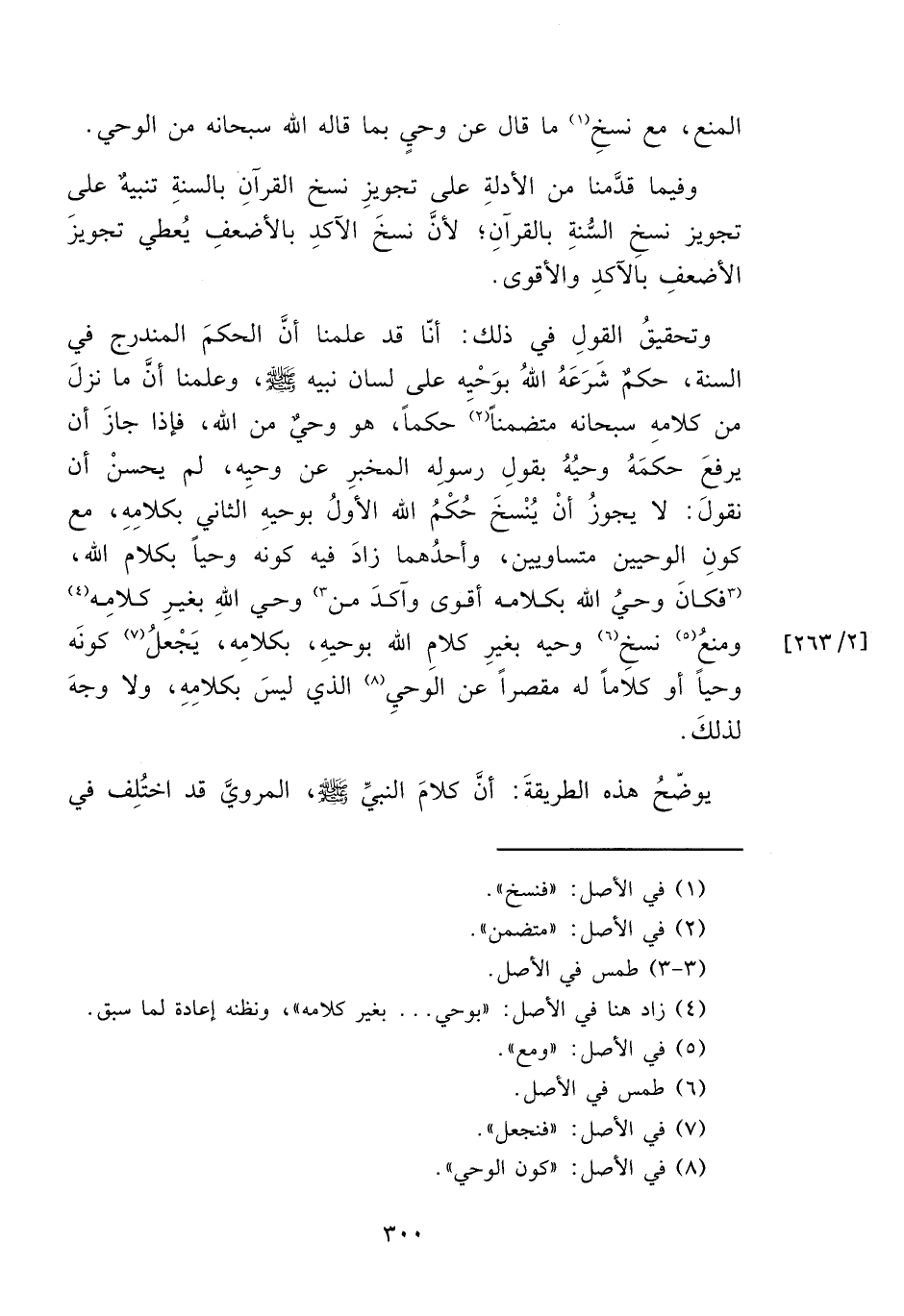 وتحقيقُ القولِ في ذلك: أنّا قد علمنا أنَّ الحكمَ المندرج في السنة، حكمٌ شَرَعَهُ اللهُ بوحيه على لسان نبيه - صلى الله عليه وسلم - وعلمنا أنَّ ما نزلَ من كلامهِ سبحانه متضمناً (٢) حكماً، هو وحيٌ من الله، فإذا جازَ أن يرفعَ حكمَهُ وحيُهُ بقولِ رسولِه المخبرِ عن وحيِه، لم يحسنْ أن نقولَ: لا يجوزُ أنْ يُنْسخَ حُكْمُ الله الأولُ بوحيهِ الثاني بكلامِهِ، مع كونِ الوحيين متساويين، وأحدُهما زادَ فيه كونه وحياً بكلام الله، (٣ فكانَ وحيُ الله بكلامه أقوى وآكدَ من ٣) وحي اللهِ بغيرِ كلامِه (٤) ومنعُ (٥) نسخِ (٦) وحيه بغيرِ كلامِ الله بوحيهِ، بكلامِه، يَجْعلُ (٧) كونَه وحياً أو كلاماً له مقصراً عن الوحي (٨) الذي ليسَ بكلامِهِ، ولا وجهَ لذلكَ.
