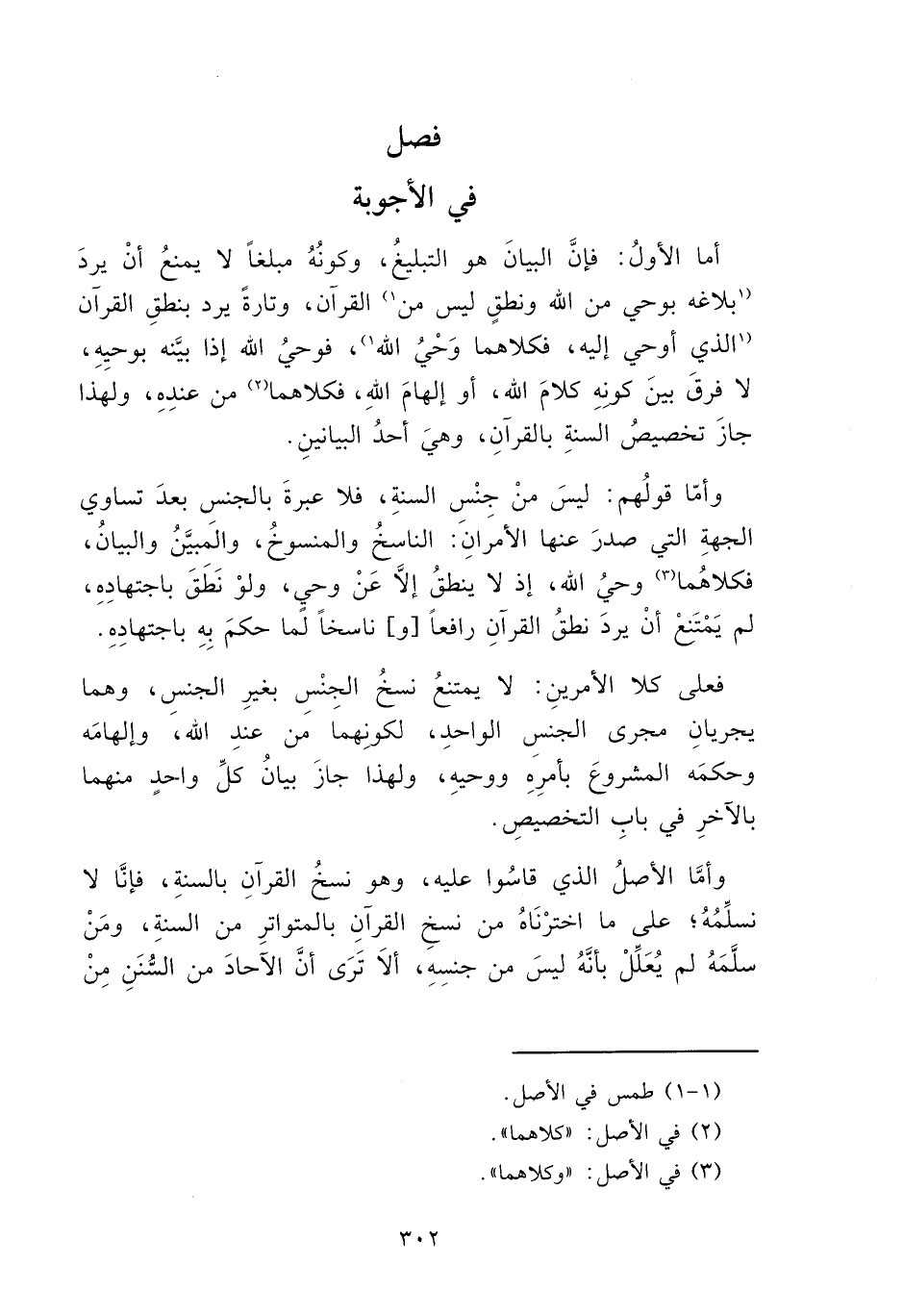 أما الأولُ: فإنَّ البيانَ هو التبليغُ، وكونُهُ مبلغاً لا يمنعُ أنْ يردَ (١ بلاغه بوحي من الله ونطقٍ ليس من ١) القرآن، وتارةً يرد بنطقِ القرآن (١ الذي أوحي إليه، فكلاهما وَحْيُ الله ١)، فوحيُ الله إذا بينه بوحيهِ، لا فرقَ بينَ كونهِ كلامَ الله، أو إلهامَ اللهِ، فكلاهما (٢) من عندِهِ، ولهَذا جازَ تخصيصُ السنةِ بالقراَنِ، وهيَ أحدُ البيانينِ.