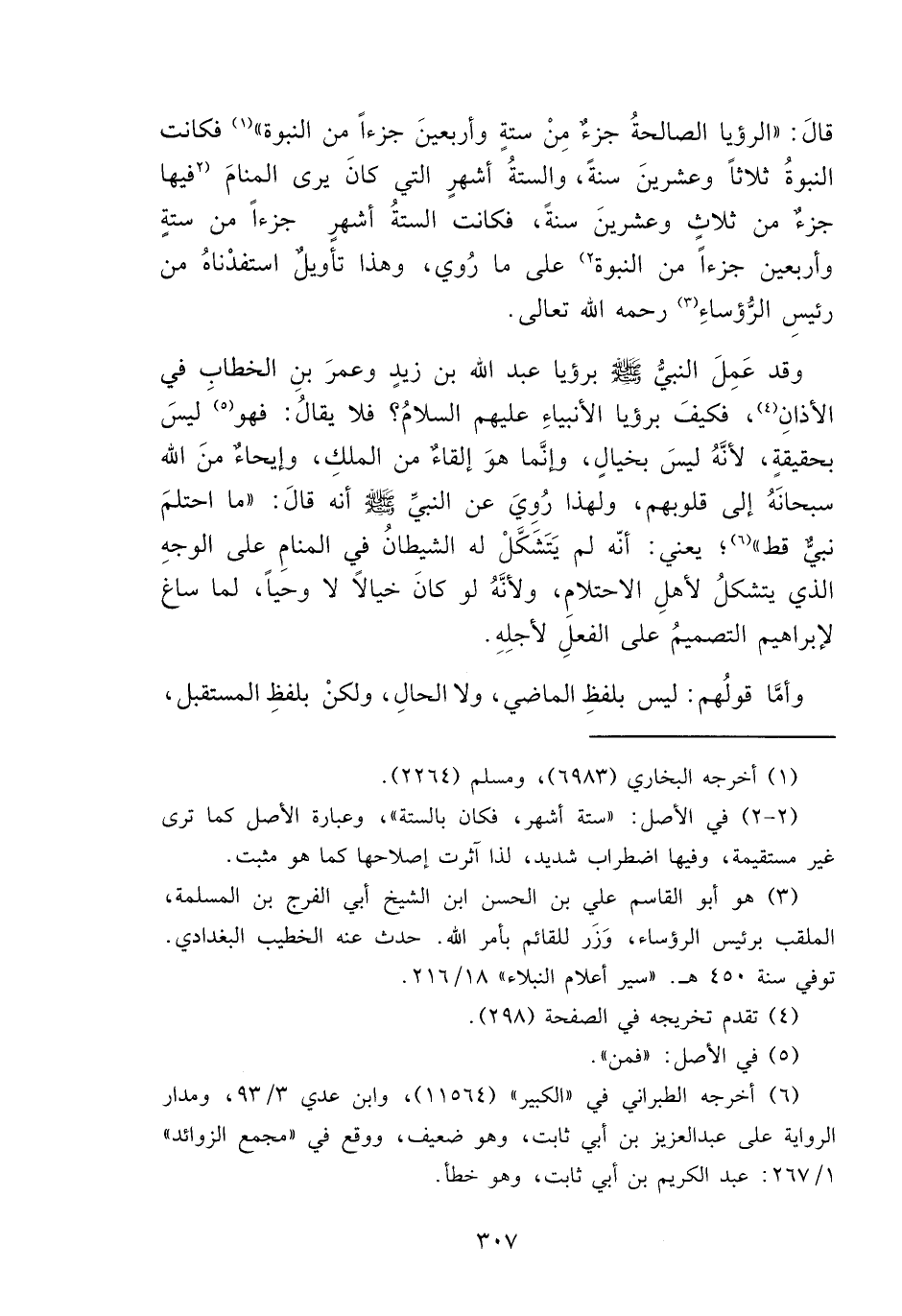 قال: "الرؤيا الصالحةُ جزءٌ مِنْ ستةٍ وأربعينَ جزءاً من النبوة" (١) فكانت النبوةُ ثلاثاً وعشرينَ سنةً، والستةُ أشهرٍ التي كانَ يرى المنامَ (٢ فيها جزء من ثلاثٍ وعشرينَ سنةً، فكانت الستةُ أشهرٍ جزءاً من ستةٍ وأربعين جزءاً من النبوة ٢) على ما رُوي، وهذا تأويل استفدْناهُ من رئيسِ الرُّؤساءِ (٣) رحمه الله تعالى.