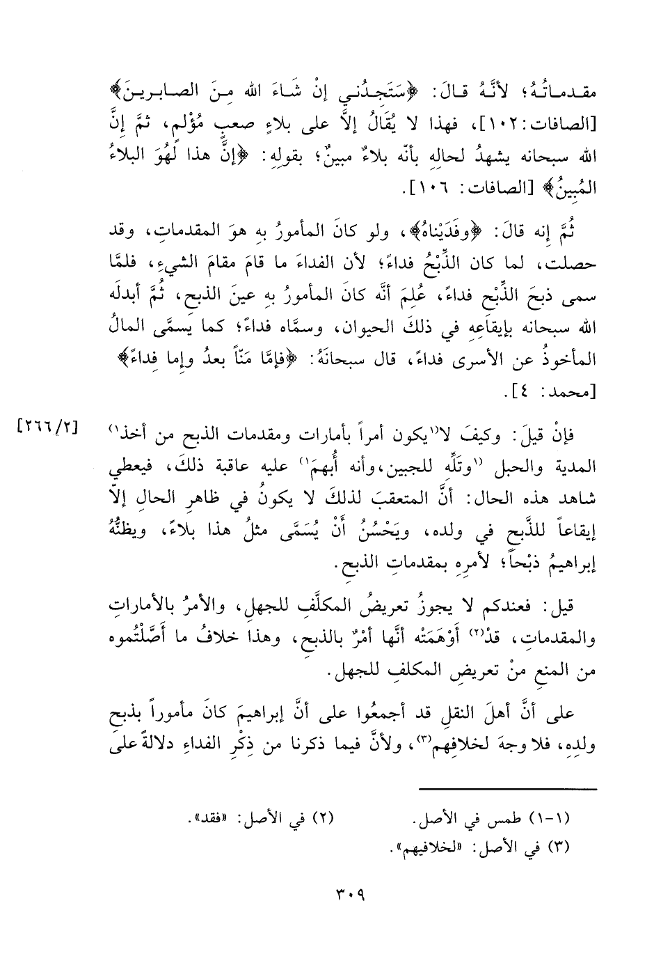 ثُمَّ إِنه قالَ: {وفَدَيْناهُ}، ولو كانَ المأمورُ بهِ هوَ المقدماتِ، وقد حصلت، لما كان الذِّبْحُ فداءً؛ لأن الفداءَ ما قامَ مقامَ الشيءِ، فلمَّا سمى ذبحَ الذِّبْح فداءً، عُلِمَ أنَّه كانَ المأمورُ بهِ عينَ الذبح، ثُمَّ أبدلَه الله سبحانه بإيقاَعِهِ في ذلكَ الحيوان، وسمَّاه فداءً؛ كما يَسمَّى المالُ المأخوذُ عن الأسرى فداءً، قال سبحانَهُ: {فَإِمَّا مَنًّا بَعْدُ وَإِمَّا فِدَاءً} [محمد: ٤].