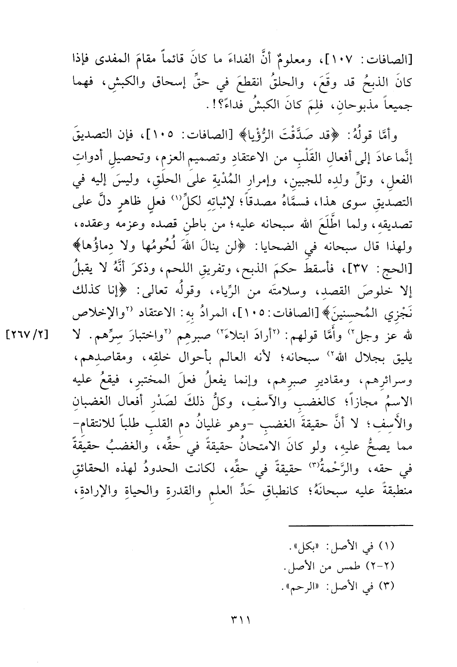 وأمَّا قولُهُ: {قَدْ صَدَّقْتَ الرُّؤْيَا} [الصافات: ١٠٥]، فإن التصديقَ إنما عادَ إلى أفعالِ القلْبِ من الاعتقادِ وتصميم العزمِ، وتحصيلِ أدواتِ الفعلِ، وتلِّ ولدِه للجبينِ، وإمرارِ المُدْيةِ علىَ الحلقِ، وليسَ إليه في التصديقِ سوى هذا، فسمَّاهُ مصدقاً، لإثباتِهِ لكلِّ (١) فعلٍ ظاهرٍ دل على تصديقهِ، ولما اطَّلَعَ الله سبحانه عليه؛ من باطنِ قصده وعزمه وعقده، ولهذا قال سبحانه فيِ الضحايا: {لَنْ يَنَالَ اللَّهَ لُحُومُهَا وَلَا دِمَاؤُهَا} [الحج: ٣٧]، فأسقط حكمَ الذبح، وتفريقِ اللحم، وذكرَ أنَّهُ لا يقبلُ إلا خلوصَ القصدِ، وسلامتَه من الرِّياء، وقولُه تعالى: {إِنَّا كَذَلِكَ نَجْزِي الْمُحْسِنِينَ} [الصافات: ١٠٥] المرادُ بِهِ: الاعتقاد (٢ والإخلاص لله عز وجل ٢) وأَمَّا قولهم: (٢ أرادَ ابتلاءَ٢) صبرهِم (٢ واختبارَ سِرِّهم. لا يليق بجلال الله ٢) سبحانه، لأنه العالم بأحوال خلقِه، ومقاصدِهم، وسرائرِهم، ومقاديرِ صبرِهم، وإنما يفعلُ فعلَ المختبرِ، فيقعُ عليه الاسمُ مجازاً، كالغضبِ والآسفِ، وكلُّ ذلكَ لصَدْرِ أفعال الغضبانِ والأَسِفِ، لا أنَّ حقيقةَ الغضبِ -وهو غليانُ دمِ القلبِ طلباً للانتقامِ- مما يصحُّ عليهِ، ولو كانَ الامتحانُ حقيقةً في حقِّه، والغضبُ حقيقةً في حقه، والرَّحْمةُ (٣) حقيقةً في حقِّهِ، لكانت الحدودُ لهذه الحقائقِ منطبقةْ عليه سبحانَهُ، كانطاقِ حَدِّ العلمِ والقدرةِ والحياةِ والإرادةِ،