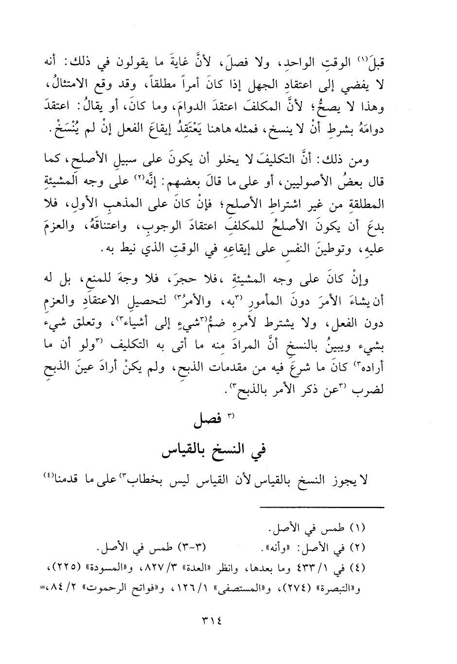 قبلَ (١) الوقتِ الواحدِ، ولا فصلَ، لأنَّ غايةَ ما يقولون في ذلك: أنه لا يفضي إلى اعتقادِ الجهل إذا كانَ أمراً مطلقاً، وقد وقع الامتثالُ، وهذا لا يصحُّ؛ لأنَّ المكلفَ اعتقدَ الدوامَ، وما كانَ، أو يقالُ: اعتقدَ دوامَهُ بشرطِ أنْ لاينسخ، فمثله هاهنا يَعْتَقِدُ إيقاعَ الفعل إنْ لم يُنْسَخْ.