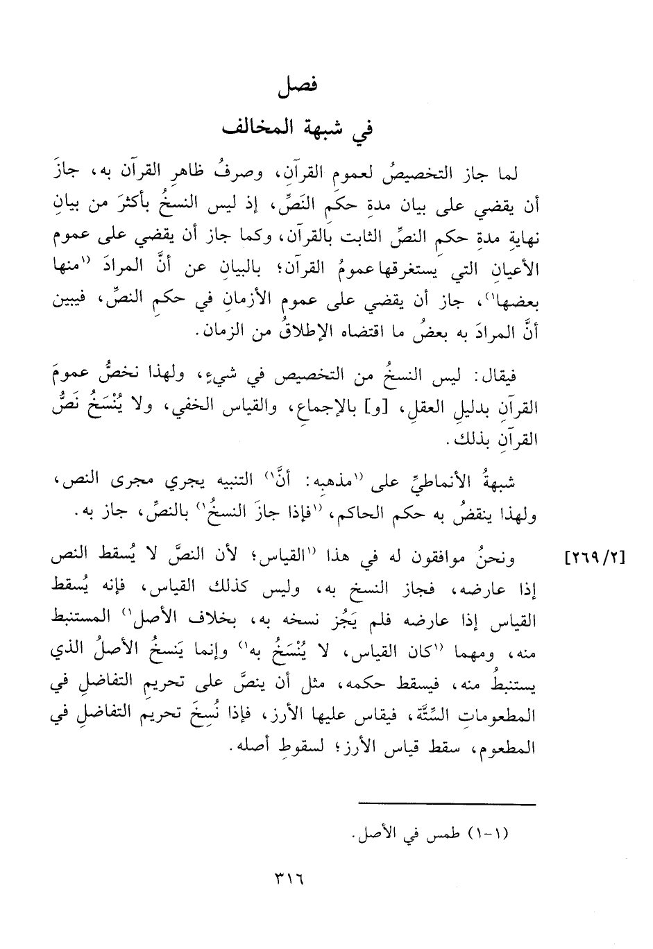 فيقال: ليس النسخُ من التخصيص في شيءٍ، ولهذا نخصُّ عمومَ القرآنِ بدليلِ العقلِ، [و] بالإجماعِ، والقياس الخفي، ولا يُنْسَخُ نَصُّ القرآنِ بذلك.