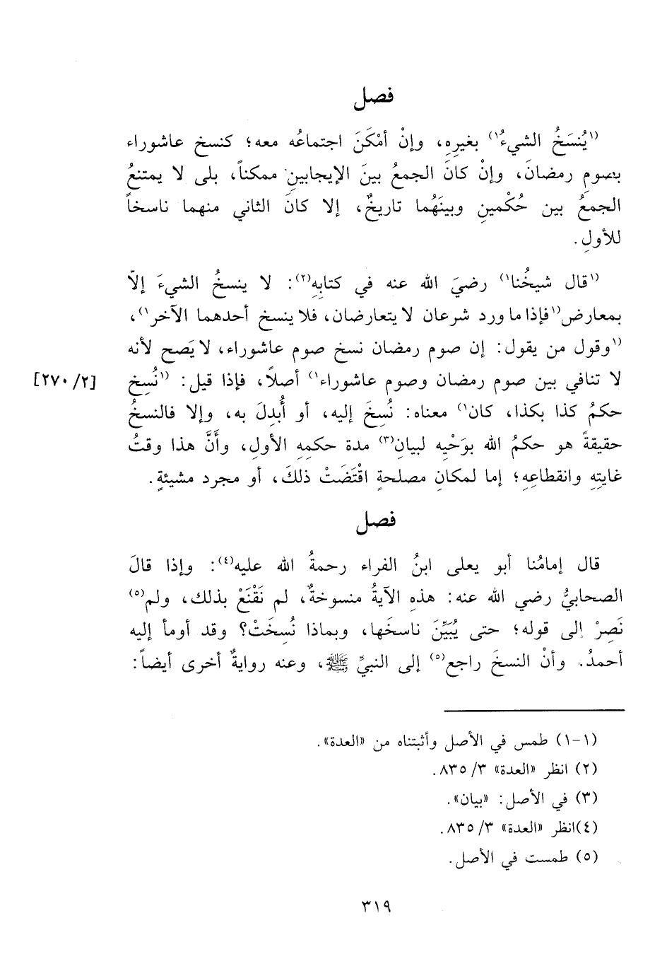 (١ قال شيخُنا ١) رضيَ الله عنه في كتابِهِ (٢): لا ينسخُ الشيءَ إلاّ بمعارض (١ فإذا ما ورد شرعان لا يتعارضان، فلا ينسخ أحدهما الآخر ١)، (١ وقول من يقول: إن صوم رمضان نسخ صوم عاشوراء، لايَصح لأنه لا تنافي بين صوم رمضان وصوم عاشوراء ١) أصلاً، فإذا قيل: (١ نُسِخ حكمُ كذا بكذا، كان ١) معناه: نُسِخَ إليه، أو أُبدِلَ به، وإلا فالنسخُ حقيقةً هو حكمُ الله بوَحْيه لبيانِ (٣) مدة حكمِهِ الأولِ، وأَنَّ هذا وقتُ غايتِهِ وانقطاعِهِ؛ إما لمكاَنِ مصلحةٍ اقْتَضَتْ ذلكَ، أو مجرد مشيئةٍ.