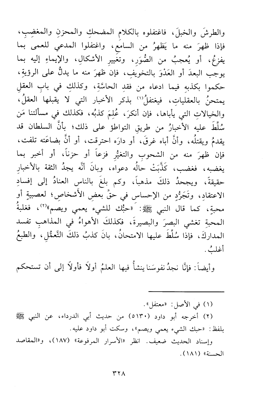 والطرشَ والخبلَ، فاغتفلوه بالكلامِ المضحكِ والمحزنِ والمغضِبِ، فإذا ظهرَ منه ما يَظهرُ من السامعِ، واغتفلوا المدعي للعمى بما يفزعُ، أو يُعجبُ من الصُّوَرِ، وتغييرِ الأشكالِ، والإيماءِ إليه بما يوجب البعدَ أو العَدْوَ بالتخويفِ، فإن ظهرَ منه ما يدلُّ على الرؤيةِ، حكموا بكذبهِ فيما ادعاه من فقدِ الحاسَّةِ، وكذلكِ في بابِ العقلِ يمتحنُ بالعقلياتِ، فيغتفلُ (١) بذكر الأخبار التي لا يقبلها العقلُ، والخيالاتِ التي يأباها، فإن أنكرَ، عُلِمَ كذبُه، فكذلك في مسألتنا مَن سُلِّطَ عليه الأخبارُ من طريقِ التواطؤ على ذلك؛ بأنَّ السلطان قد يقدمُ ويقتلُه، وأنَّ أباه غرقَ، أو دارَه احترقت، أو أنَّ بضاعَته تلفت، فإن ظهرَ منه من الشحوب والتغيّرِ فزعاً أو حزناً، أو أخبر بما يغضبه، فغصْب، كَذَّبَتْ حَالُه دعواه، وبانَ أنَّه يجدُ الثقة بالأخبارِ حقيقةً، ويجحدُ ذلكَ مذهباً، وكم بلغ بالناس العنادُ إلى إفسادِ الاعتقادِ، وتَجَرُّدٍ من الإحساس في حقِّ بعضِ الأَشخاصِ؛ لعصبيةٍ أو محبةٍ، كما قال النبي - صلى الله عليه وسلم -: "حبُّك للشيء يعمي ويصم" (٢)، فغلبةُ المحبةِ تغشي البصرَ والبصيرةَ، فكذلكَ الأهواءُ في المذاهب تفسد المداركَ، فإذا سُلِطَ عليها الامتحانُ، بانَ كذبُ ذلكَ التَّعمُّلِ، والطبعُ أغلبُ.