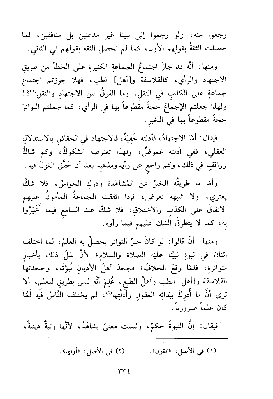 ومنها: أنَّه قد جازَ اجتماعُ الجماعةِ الكثيرةِ على الخطأ من طريقِ الاجتهاد والرأي، كالفلاسفة و [أهل] الطب، فهلا جوزتم اجتماع جماعةٍ على الكذبِ في النقلِ، وما الفرقُ بين الاجتهادِ والنقل (١)؟! ولهذا جعلتم الإجماعَ حجةً مقطوعاً بها في الرأي، كما جعلتم التواترَ حجة مقطوعاً بها في الخبرِ.