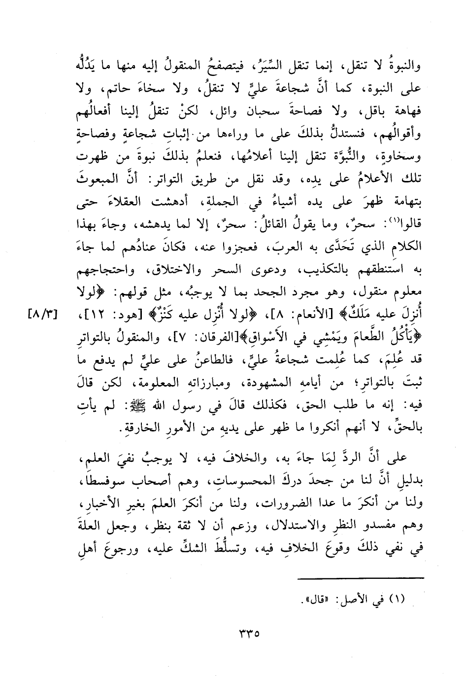 والنبوةُ لا تنقل، إنما تنقل السِّيَرُ، فيتصفحُ المنقولُ إليه منها ما يَدُلُه على النبوة، كما أنَّ شجاعةَ عليٍّ لا تنقلُ، ولا سخاءَ حاتم، ولا فهاهة باقل، ولا فصاحةَ سحبان وائل، لكنْ تنقلُ إلينا أفعالُهم وأقوالُهم، فنستدلُّ بذلكَ على ما وراءها من. إثباتِ شجاعةٍ وفصاحةٍ وسخاوةٍ، والنُّبوَّة تنقل إلينا أعلامُها، فنعلمُ بذلكَ نبوةَ من ظهرت تلك الأعلامُ على يدِه، وقد نقل من طريق التواتر: أنَّ المبعوثَ بتهامة ظهرَ على يده أشياءُ في الجملةِ، أدهشت العقلاءَ حتى قالوا (١): سحرٌ، وما يقول القائلُ: سحرٌ، إلا لما يدهشه، وجاءَ بهذا الكلامِ الذي تَحَدَّى به العربَ، فعجزوا عنه، فكانَ عنادُهم لما جاءَ به استنطقهم بالتكذيب، ودعوى السحر والاختلاف، واحتجاجهم معلوم منقول، وهو مجرد الجحد بما لا يوجبُه، مثل قولهم: {لَوْلَا أُنْزِلَ عَلَيْهِ مَلَكٌ} [الأنعام: ٨] {لَوْلَا أُنْزِلَ عَلَيْهِ كَنْزٌ} [هود: ١٢] , {يَأْكُلُ الطَّعَامَ وَيَمْشِي فِي الْأَسْوَاقِ} [الفرقان: ٧]، والمنقولُ بالتواترِ قد عُلِمَ، كما عُلِمت شجاعةُ عليٍّ، فالطاعنُ على عليٍّ لم يدفع ما ثبتَ بالتواترِ؛ من أيامهِ المشهودة، ومبارزاتهِ المعلومة، لكن قالَ فيه: إنه ما طلب الحق، فكذلك قالَ في رسول الله - صلى الله عليه وسلم -: لم يأتِ بالحقِّ، لا أنهم أنكروا ما ظهر على يديهِ من الأمورِ الخارقةِ.