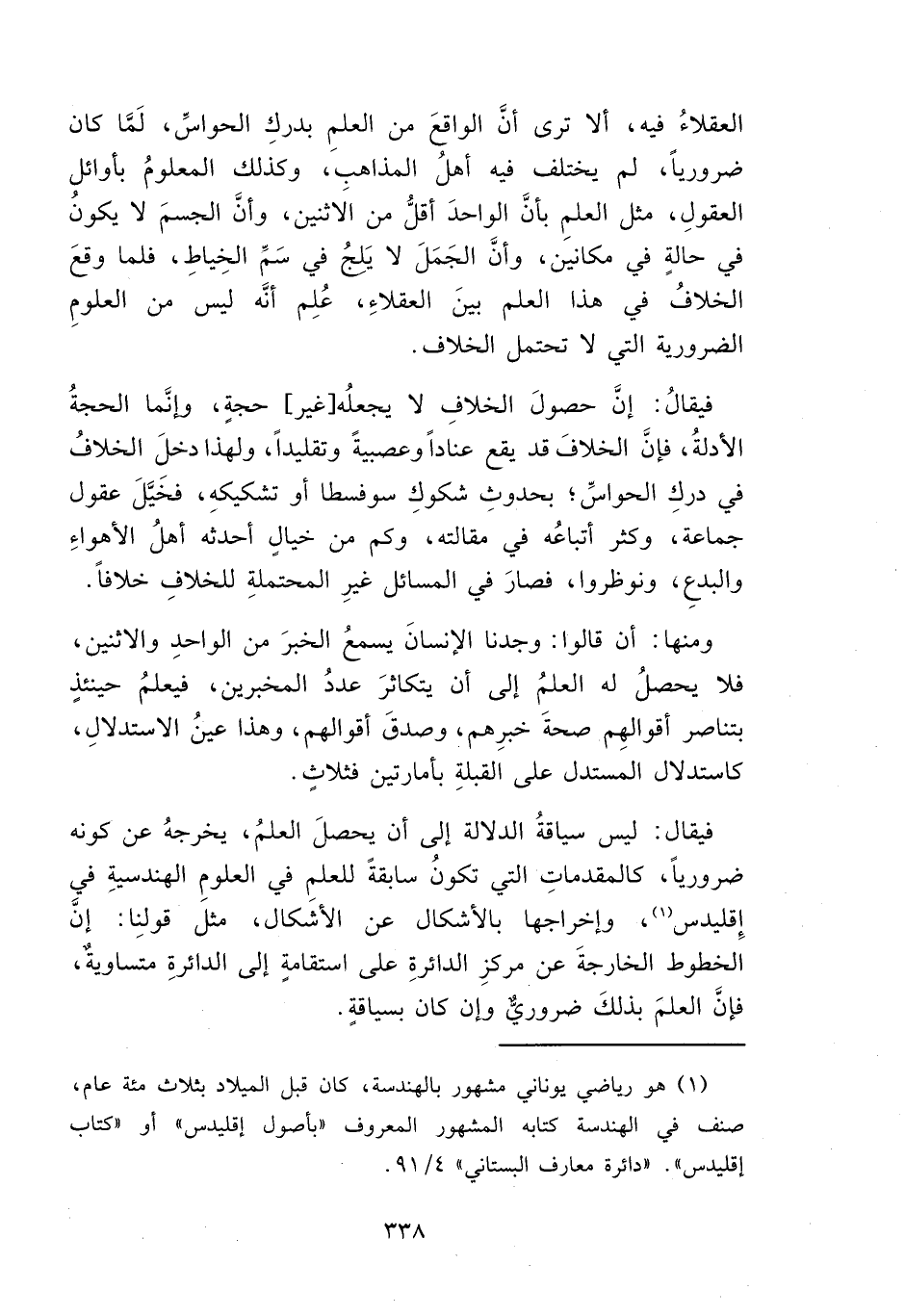 فيقال: ليس سياقةُ الدلالة إلى أن يحصلَ العلمُ، يخرجهُ عن كونه ضرورياً، كالمقدماتِ التي تكونُ سابقةً للعلمِ في العلومِ الهندسيةِ في إِقليدس (١)، وإخراجها بالأشكال عن الأشكال، مثل قولنِا: إنَّ الخطوط الخارجةَ عن مركزِ الدائرةِ على استقامةٍ إلى الدائرةِ متساويةٌ، فإنَّ العلمَ بذلكَ ضروريٌّ وإن كان بسياقةٍ.