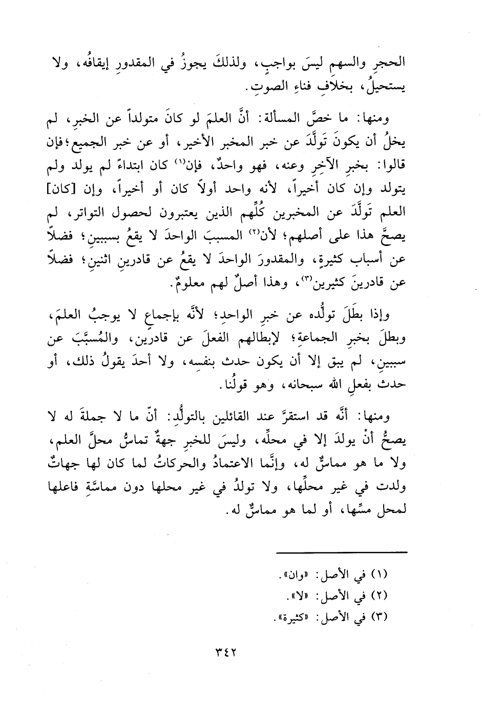 وإذا بطَلَ تولُّده عن خبرِ الواحدِ؛ لأنَّه بإجماعٍ لا يوجبُ العلمَ، وبطلَ بخبرِ الجماعةِ؛ لإبطالهم الفعلَ عن قادرين، والمُسبَّبَ عن سببينِ، لم يبق إلا أن يكون حدث بنفسِه، ولا أحدَ يقولُ ذلك، أو حدث بفعلِ الله سبحانه، وهو قولُنا.
