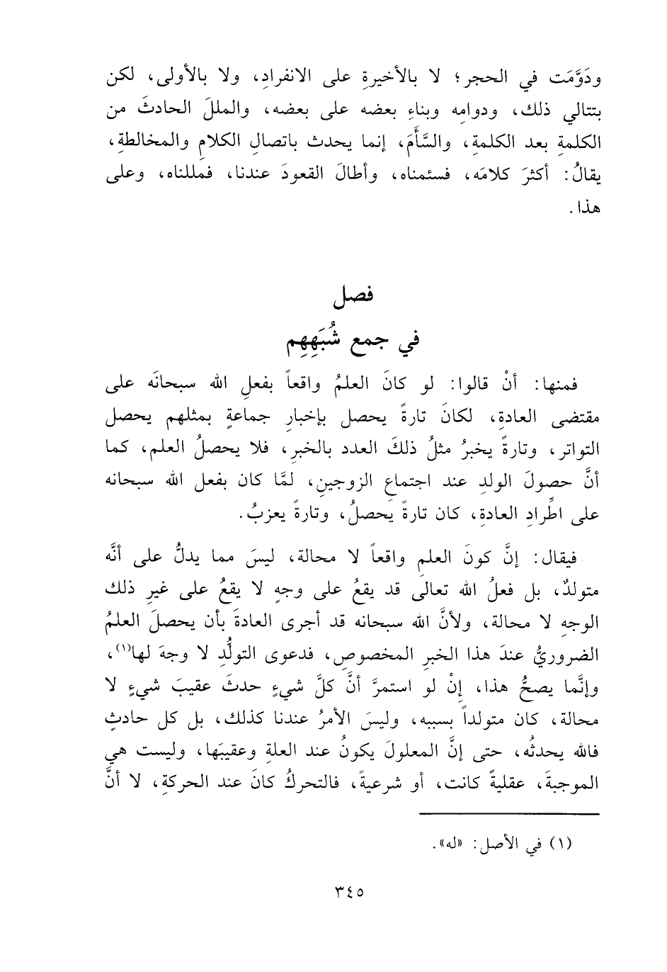 فيقال: إنَّ كونَ العلمِ واقعاً لا محالة، ليسَ مما يدلُّ على أنَّه متولدٌ، بل فعل الله تعالى قد يقعُ على وجهٍ لا يقعُ على غير ذلك الوجهِ لا محالة، ولأنَّ الله سبحانه قد أجرى العادةَ بأن يحصلَ العلمُ الضروريُّ عندَ هذا الخبرِ المخصوصِ، فدعوى التولُدِ لا وجهَ لها (١)، وإنَّما يصح هذا، إن لو استمرَّ أنَّ كلَّ شيءٍ حدثَ عقيبَ شيءٍ لا محالة، كان متولداَ بسببه، وليس الأمرُ عندنا كذلك، بل كل حادثٍ فالله يحدثه، حتى إنَّ المعلولَ يكونُ عند العلةِ وعقيبَها، وليست هي الموجبةَ، عقليةً كانت، أو شرعيةً، فالتحرك كانَ عند الحركةِ، لا أنَّ