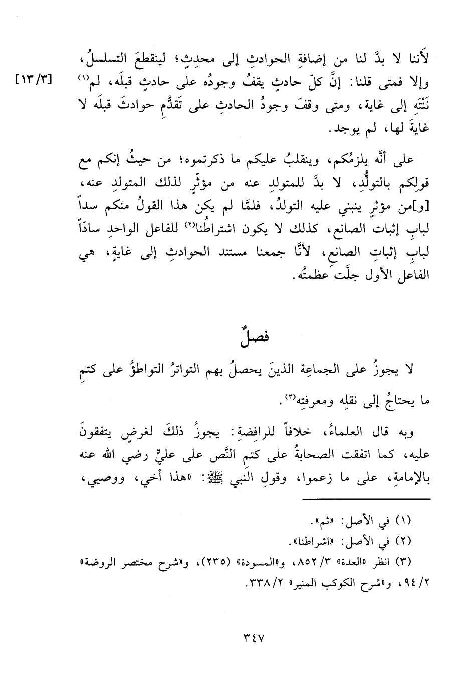 لأَننا لا بدَّ لنا من إضافةِ الحوادثِ إلى محدِثٍ؛ لينقطعَ التسلسلُ، وإلا فمتى قلنا: إنَّ كل حادثٍ يقفُ وجودُه على حادثٍ قبلَه، لم (١) نَنْتَهِ إلى غاية، ومتى وقفَ وجودُ الحادثِ على تَقدُّمِ حوادثَ قبلَه لا غايةَ لها، لم يوجد.
