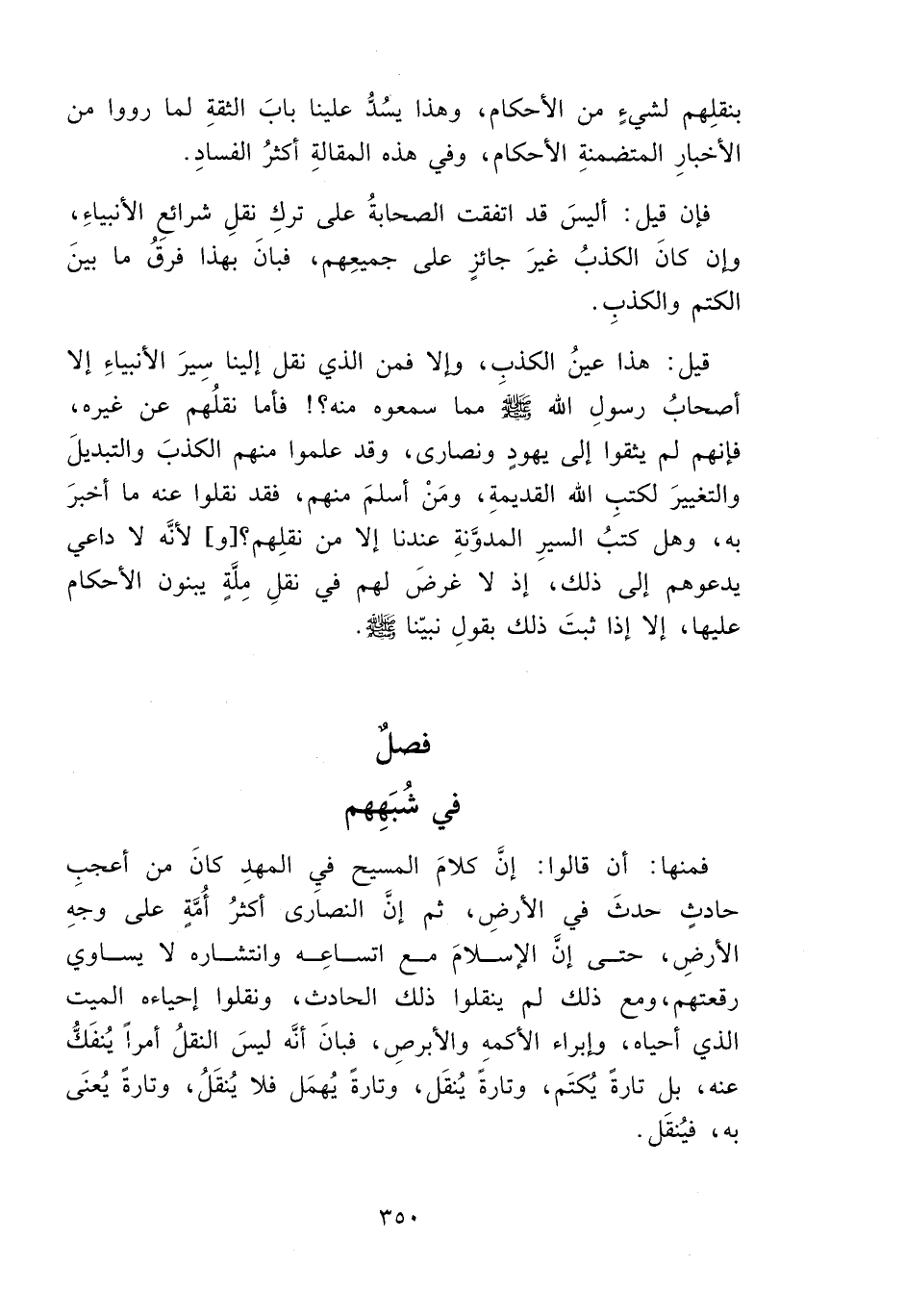 قيل: هذا عينُ الكذب، وإلا فمن الذي نقل إلينا سِيرَ الأنبياءِ إلا أصحابُ رسول الله - صلى الله عليه وسلم - مما سمعوه منه؟! فأمَّا نقلُهم عن غيره، فإنهم لم يثقوا إلى يهودٍ ونصارى، وقد علموا منهم الكذبَ والتبديلَ والتغييرَ لكتبِ الله القديمةِ، ومَنْ أسلمَ منهم، فقد نقلوا عنه ما أخبرَ به، وهل كتبُ السيرِ المدوَّنةِ عندنا إلا من نقلِهم؟ [و] لأنَّه لا داعي يدعوهم إلى ذلك، إذ لا غرضَ لهم في نقلِ مِلَّةٍ يبنون الأحكام عليها، إلا إذا ثبتَ ذلك بقول نبيّنا - صلى الله عليه وسلم -.