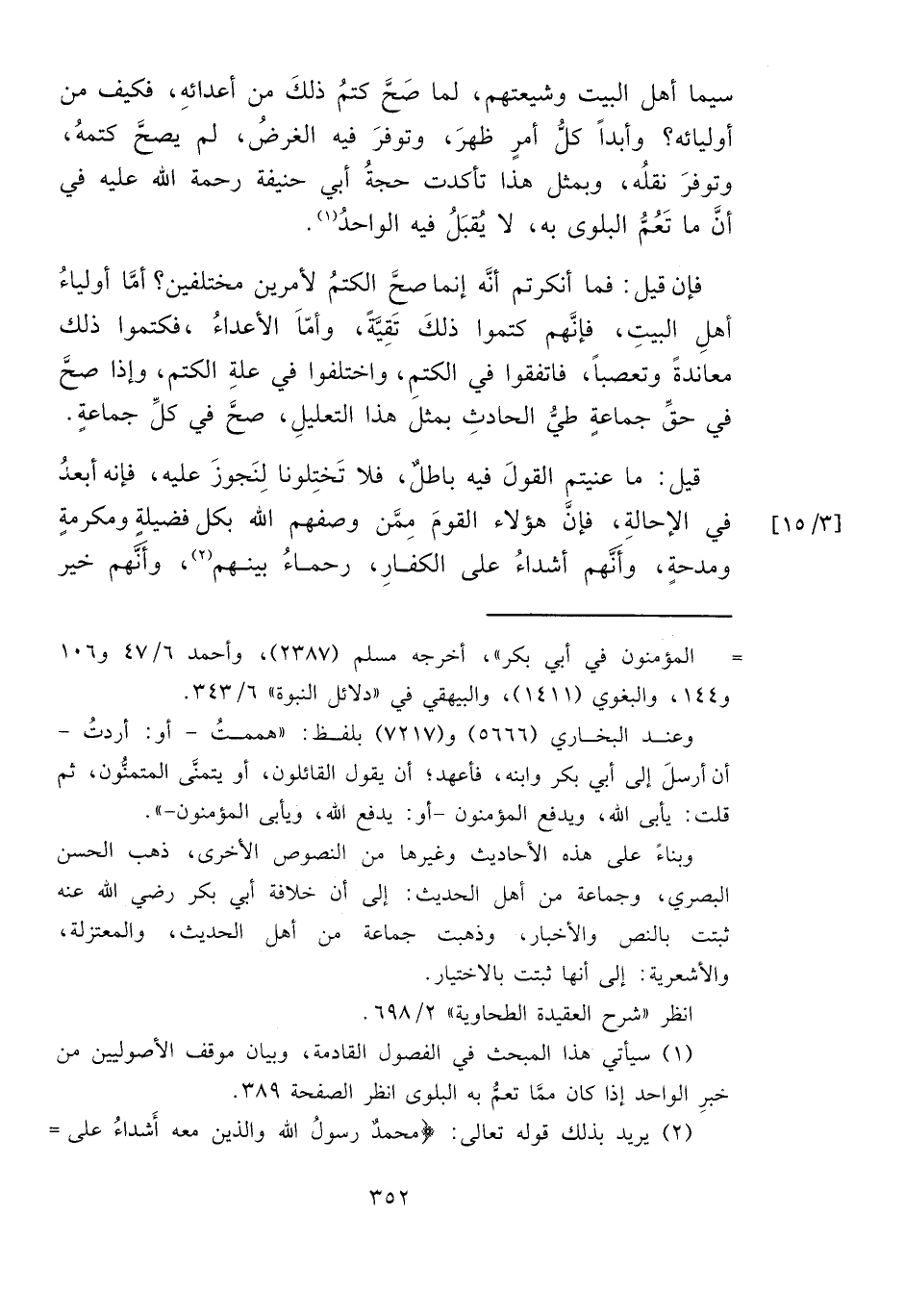 فإن قيل: فما أنكرتم أنَّه إنما صحَّ الكتمُ لأمرين مختلفين؛ أمَّا أولياءُ أهلِ البيتِ، فإنَّهم كتموا ذلكَ تَقِيّهً، وأمّاَ الأعداءُ، فكتموا ذلك معاندةً وتعصباً، فاتفقوا في الكتمِ، واختلفوا في علةِ الكتم، وإذا صحَ في حقِّ جماعةٍ طيُّ الحادثِ بمثل هذا التعليلِ، صحَّ في كلِّ جماعةٍ.