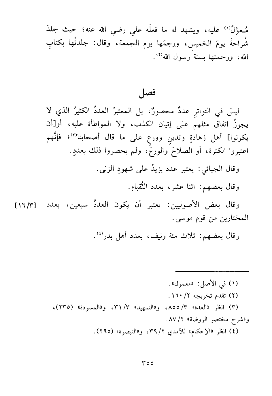 ليسَ في التواترِ عدد محصورٌ، بل المعتبرُ العددُ الكثيرُ الذي لا يجوز اتفاق مثلهم على إتيان الكذب، ولا المواطأة عليه، أو [أن يكونوا]، أهل زهادةٍ وتدينٍ وورعٍ على ما قال أصحابنا (٣)؛ فإنَّهم اعتبروا الكثرة، أو الصلاحَ والورعَ، ولم يحصروا ذلك بعددٍ.