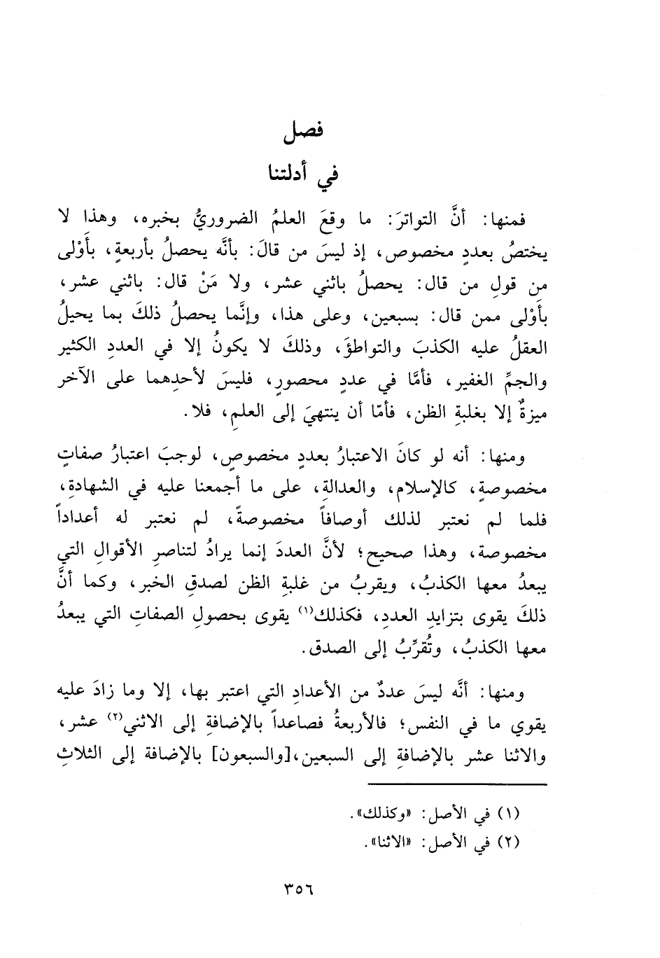 فمنها: أنَّ التواترَ: ما وقعَ العلمُ الضروريُّ بخبره، وهذا لا يختصُ بعدد مخصوص، إذ ليسَ من قالَ: بأنَّه يحصلُ بأربعةٍ، بأَوْلى من قولِ من قال: يحصلُ باثني عشر، ولا مَنْ قال: باثني عشر، بأَوْلى ممن قال: بسبعين، وعلى هذا، وإنَّما يحصلُ ذلكَ بما يحيلُ العقلُ عليه الكذبَ والتواطؤَ، وذلكَ لا يكونُ إلا في العددِ الكثير والجمِّ الغفير، فأمَّا في عددٍ محصورٍ، فليسَ لأحدِهما على الآخر ميزةٌ إلا بغلبةِ الظن، فأمّا أن ينتهيَ إلى العلمِ، فلا.