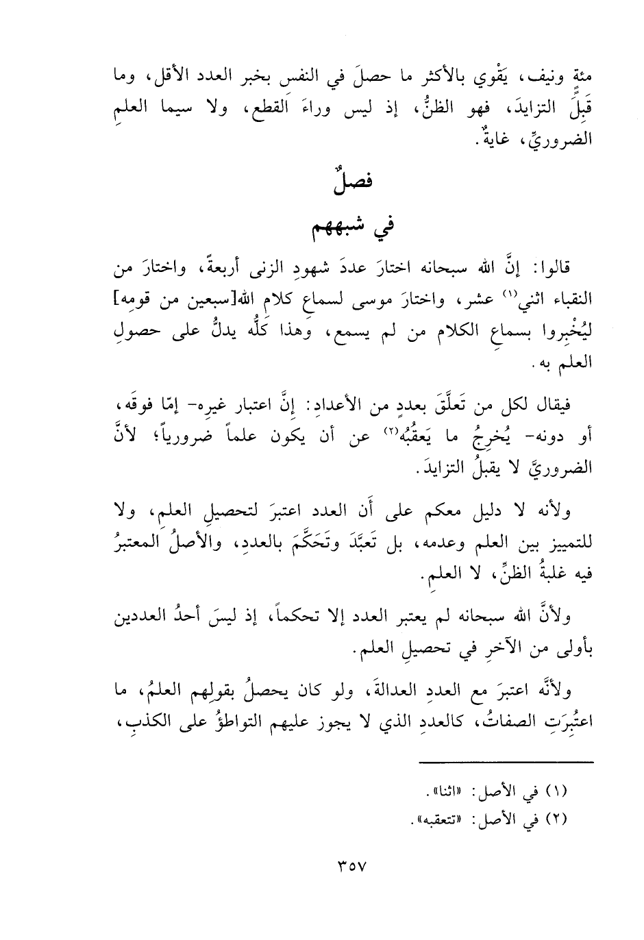 ولأنَ الله سبحانه لم يعتبر العدد إلا تحكماً، إذ ليسَ أحدُ العددين بأولى من الآخرِ في تحصيلِ العلم.