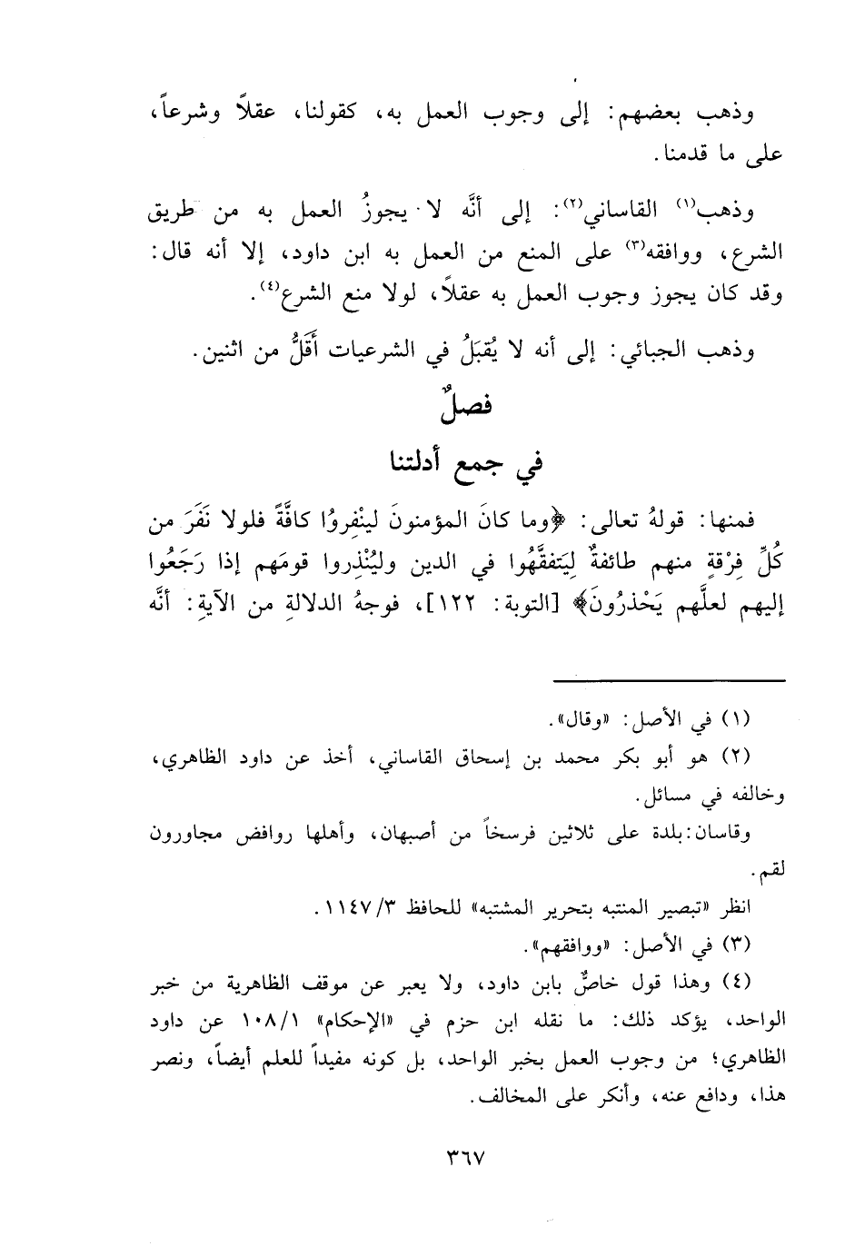 فمنها: قولهُ تعالى: {وَمَا كَانَ الْمُؤْمِنُونَ لِيَنْفِرُوا كَافَّةً فَلَوْلَا نَفَرَ مِنْ كُلِّ فِرْقَةٍ مِنْهُمْ طَائِفَةٌ لِيَتَفَقَّهُوا فِي الدِّينِ وَلِيُنْذِرُوا قَوْمَهُمْ إِذَا رَجَعُوا إِلَيْهِمْ لَعَلَّهُمْ يَحْذَرُونَ (١٢٢)} [التوبة: ١٢٢]، فوجهُ الدلالةِ من الآيةِ: أنَّه