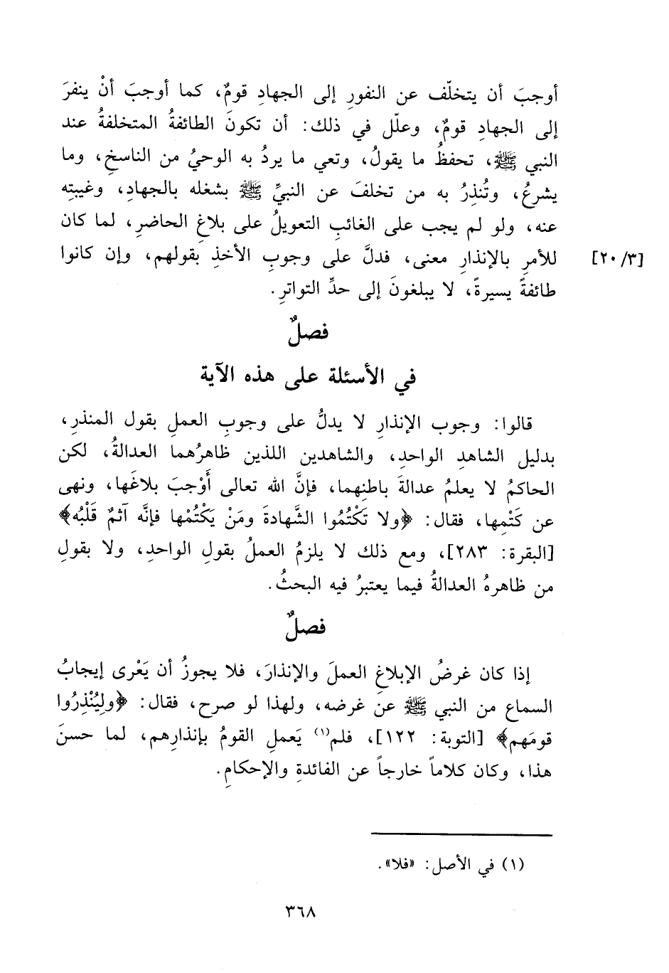 أوجبَ أن يتخلف عن النفورِ إلى الجهادِ قومٌ، كما أوجبَ أنْ ينفرَ إلى الجهادِ قومٌ، وعلّل في ذلك: أن تكونَ الطائفةُ المتخلفةُ عند النبي - صلى الله عليه وسلم -، تحفظُ ما يقولُ، وتعي ما يردُ به الوحيُ من الناسخِ، وما يشرعُ، وتُنذِرُ به من تخلفَ عن النبي - صلى الله عليه وسلم - بشغله بالجهادِ، وغيبتِه عنه، ولو لم يجب على الغائبِ التعويلُ على بلاغ الحاضرِ، لما كان للأمرِ بالإنذارِ معنى، فدلَّ على وجوبِ الأخذِ بقولهم، وإن كانوا طائفةً يسيرةً، لا يبلغونَ إلى حدِّ التواترِ.