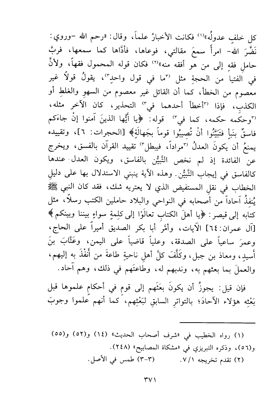 كل خل عدولُه" (١) فكانت الأخبارُ علماً، وقال: "رحم الله -وروي: نَضَّرَ الله- امرأً سمعَ مقالتي، فوعاها، فأدَّاها كما سمعها، فربَّ حاملِ فقهٍ إلى من هو أفقه منه" (٢) فكان قوله المحمول فقهاً، ولأنَّ في الفتيا من الحجةِ مثل (٣ ما في قول واحدٍ ٣)، يقول قولاً غير معصوم من الخطأ، كما أن القائل غير معصوم من السهوِ والغلطِ أو الكذب، فإذا (٣ أخطأ أحدهما في ٣) التحذير، كان الآخر مثله، (٣ وحكَمه حكمه، كما في ٣) قوله: {يَا أَيُّهَا الَّذِينَ آمَنُوا إِنْ جَاءَكُمْ فَاسِقٌ بِنَبَإٍ فَتَبَيَّنُوا أَنْ تُصِيبُوا قَوْمًا بِجَهَالَةٍ} [الحجرات: ٦]، وتقييده يمنعُ أن يكونَ العدلُ (٣ مراداً، فيبطل ٣) تقييد القرآن بالفسق، ويخرج عن الفائدة إذ لم نخص التَّبيُّن بالفاسق، ويكون العدل عندها كالفاسق في إيجاب التَّبيُّن. وهذه الآية ينبني الاستدلال بها على دليلِ الخطاب في نقلِ المستفيض الذي لا يعتريه شك، فقد كان النبي - صلى الله عليه وسلم - يُنفِذُ آحاداً من أصحابه في النواحي والبلاد حاملين الكتب رسلاً، مثل كتابه إلى قيصر: {قُلْ يَا أَهْلَ الْكِتَابِ تَعَالَوْا إِلَى كَلِمَةٍ سَوَاءٍ بَيْنَنَا وَبَيْنَكُمْ} [آل عمران: ٦٤] الآيات, وأمَّر أبا بكر الصديق أميراً على الحاج، وعمرَ ساعياً على الصدقة، وعلياً قاضياً على اليمن، وعَتَّابَ بنَ أَسيدٍ، ومعاذ بن جبل، وكَلَّفَ كلَّ أهلِ ناحيةٍ طاعةَ من أَنفْذَ به إليهم، والعملَ بما بعثهم به، وندبهم له، وطاعتَهم في ذلك، وهم آحاد.