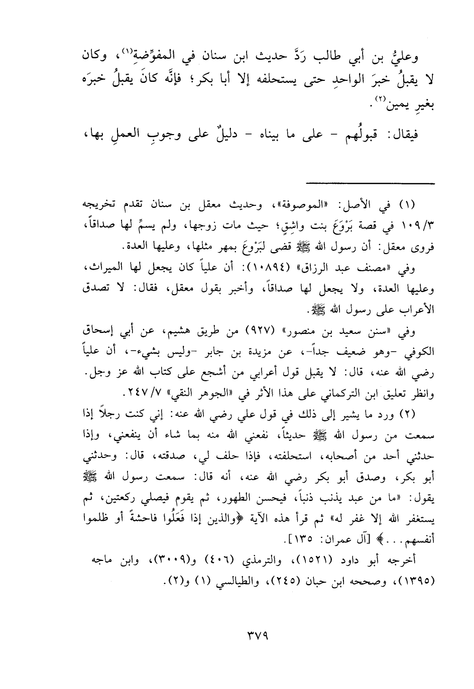 وعليُّ بن أبي طالب رَدَّ حديث ابن سنان في المفوِّضةِ (١)، وكان لا يقبلُ خبرَ الواحدِ حتى يستحلفه إلا أبا بكر؛ فإنَّه كانَ يقبلُ خبرَه بغيرِ يمين (٢).