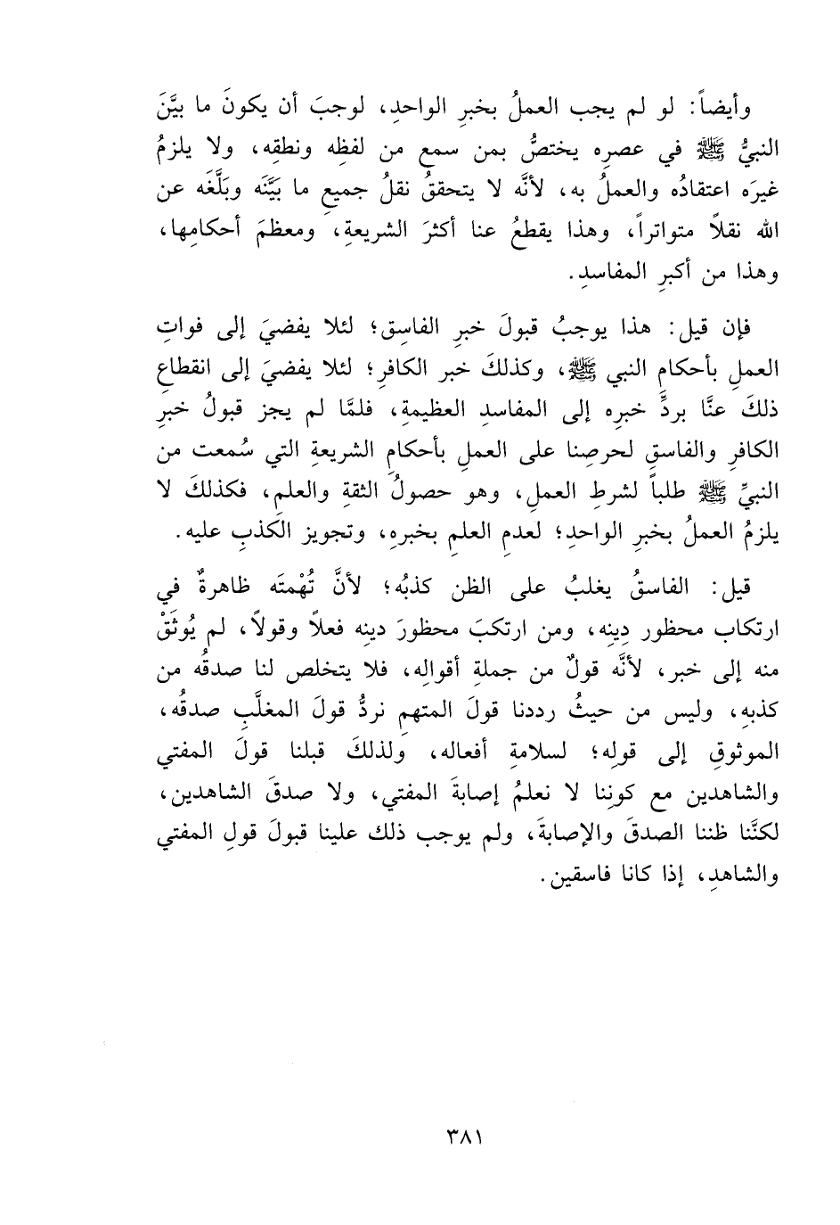 فإن قيل: هذا يوجبُ قبولَ خبرِ الفاسِق؛ لئلا يفضيَ إلى فواتِ العملِ بأحكام النبي - صلى الله عليه وسلم - وكذلكَ خبر الكافرِ، لئلا يفضيَ إلى انقطاعِ ذلكَ عنَّا برد خبرِه إلى المفاسدِ العظيمةِ، فلما لم يجز قبولُ خبرِ الكافرِ والفاسقِ لحرصِنا على العملِ بأحكامِ الشريعةِ التي سُمعت من النبيِّ - صلى الله عليه وسلم - طلباً لشرطِ العملِ، وهو حصولُ الثقةِ والعلمِ، فكذلكَ لا يلزمُ العملُ بخبرِ الواحدِ؛ لعدمِ العلمِ بخبرهِ، وتجويز الكذبِ عليه.