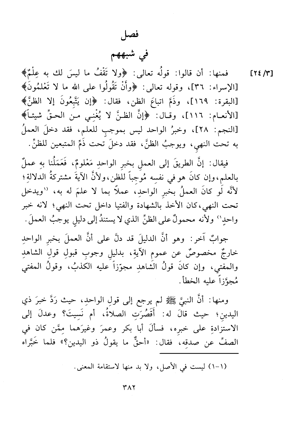 فمنها: أن قالوا: قولُه تعالى: {وَلَا تَقْفُ مَا لَيْسَ لَكَ بِهِ عِلْمٌ} [الإسراء: ٣٦]، وقوله تعالى: {وَأَنْ تَقُولُوا عَلَى اللَّهِ مَا لَا تَعْلَمُونَ} [البقرة: ١٦٩]، وذَمَّ اتباعَ الظن، فقال: {إِنْ يَتَّبِعُونَ إِلَّا الظَّنَّ} [الأنعام: ١١٦]، وقال: {وَإِنَّ الظَّنَّ لَا يُغْنِي مِنَ الْحَقِّ شَيْئًا} [النجم: ٢٨]، وخبرُ الواحد ليس بموجبٍ للعلم، فقد دخلَ العملُ به تحت النهيِ، ويوجبُ الظنَّ، فقد دخلَ تحت ذَمِّ المتبعين للظنِّ.