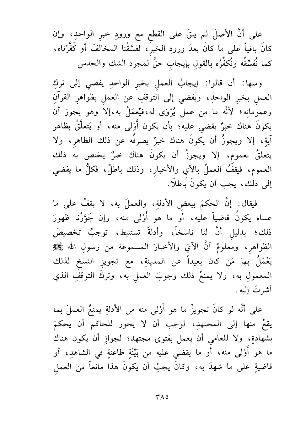 ومنها: أن قالوا: إيجابُ العملِ بخبرِ الواحدِ يفضي إلى تركِ العملِ بخبرِ الواحدِ، ويفضي إلى التوقفِ عن العملِ بظواهرِ القرآنِ وعموماتِه، لأنَّه ما من عمل يُرْوَى له، فيُعمَلُ به، إلا وهو يجوز أن يكونَ هناك خبرٌ يقضي عليه؛ بأن يكون أَوْلى منه، أو يَتعلَّقُ بظاهر آيةٍ، إلا ويجوزُ أن يكونَ هناك خبرٌ يصرفه عن ذلك الظاهرِ، ولا يتعلقُ بعمومٍ، إلا ويجوزُ أن يكونَ هناك خبرٌ يختص به ذلك العموم، فيقفُ العملُ بالآي والأخبارِ، وذلك باطلٌ، فكل ما يفضي إلى ذلك، يجب أن يكونَ بَاطلاً.