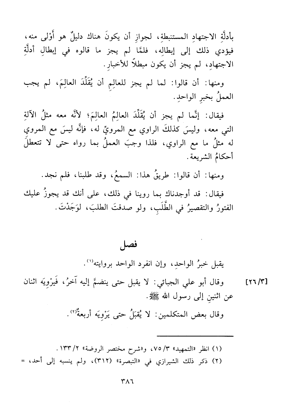ومنها: أن قالوا: لما لم يجز للعالِمِ أن يُقَلِّدَ العالِمَ، لم يجب العملُ بخبرِ الواحدِ.